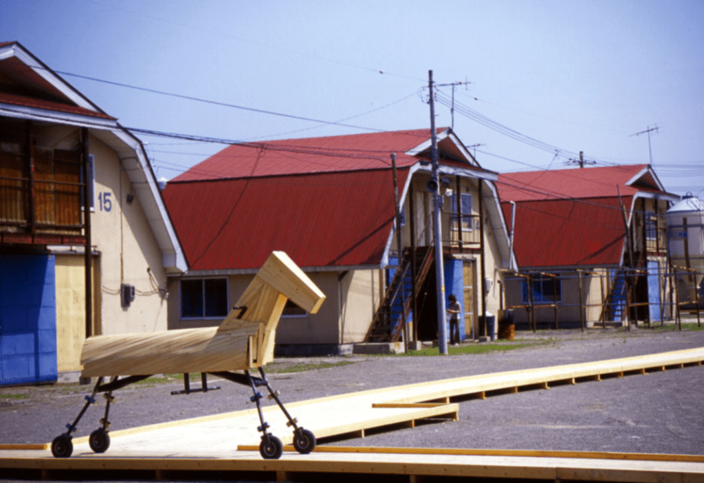 The group exhibition: Tokachi International Contemporary Art Exhibition: Demeter was an international event held at the Obihiro Racetrack in Hokkaido, commemorating the 120th anniversary of Obihiro City’s municipal administration. Participating artists visited Obihiro to engage with the site and create works inspired by its local memories and characteristics. The horse stables, built for banei racing—a form of draft horse racing unique to Hokkaido—served as both venue and thematic context. For the exhibition, Kawamata arranged for a two-year-old male horse to be named “Demeter,” which actively participated in races at the racetrack, while wooden sculptures representing “Demeter” traversed the exhibition site, symbolically highlighting the horse’s absence.