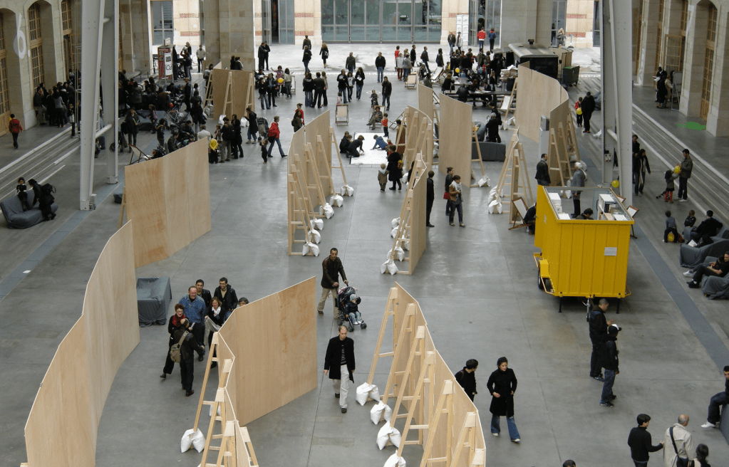 For the Art Unlimited section of Art Basel 2004 — a special exhibition program introduced in 2000 to showcase large-scale art projects — Tadashi Kawamata created a wooden walkway suspended above the fair, allowing visitors to overlook the booths below.
