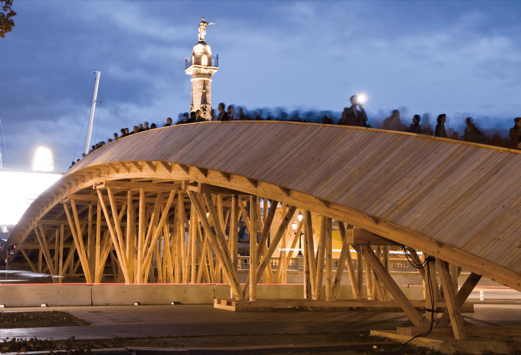For his participation in the 2009 Evento Biennale, held from 9 to 18 October 2009, Kawamata created a monumental wooden footbridge connecting the city center to the riverbank. Measuring 12 by 120 meters, this site-specific installation was built during workshops with students from the School of Architecture, using 405 cubic meters of maritime pine felled in January 2009 after Storm Klaus. The work remained in situ until June 2010.