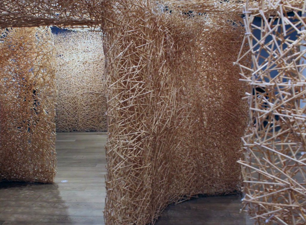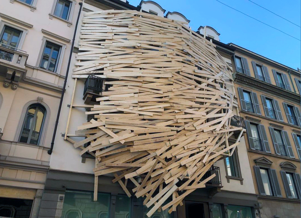 Nest in Milano was created for Kawamata’s solo exhibition at BUILDING gallery in Milan. This site-specific installation spanned approximately 120 m² of the building’s external façade and extended into its interior, transforming the gallery into a monumental nest. The piece was constructed by the artist from March 21 to 28, 2022, in collaboration with students from the Brera Academy of Fine Arts (Accademia di Brera). Additionally, four Nest pieces were installed in various locations across the city: beneath a balcony of the Grand Hotel et de Milan, on the perimeter wall of the Centro Congressi Fondazione Cariplo, in the Cortile della Magnolia at Palazzo di Brera, and on a light pole near the entrance of the ADI Design Museum.