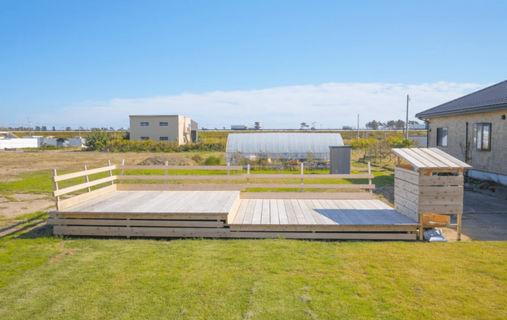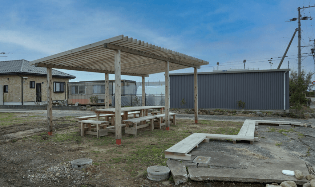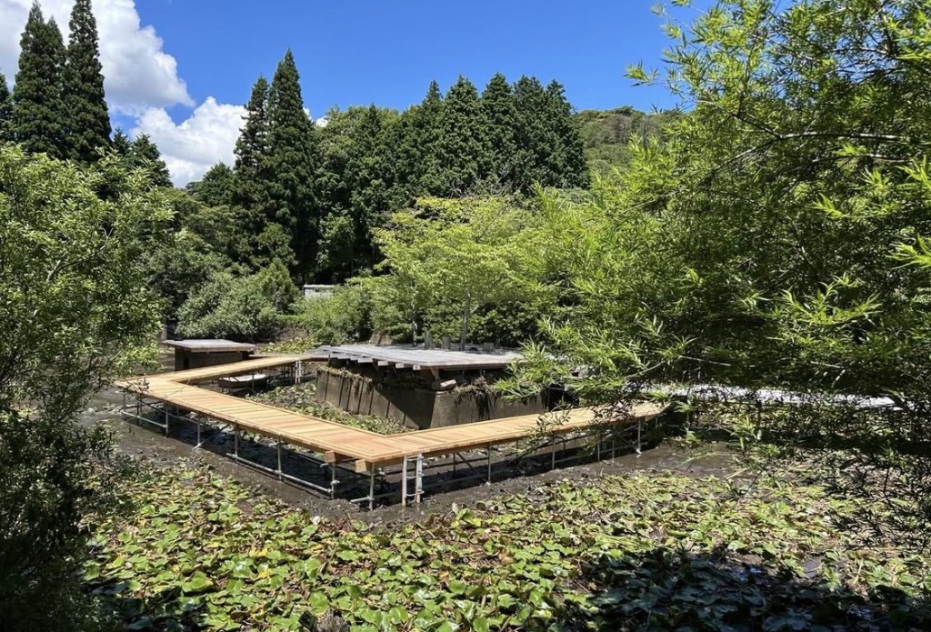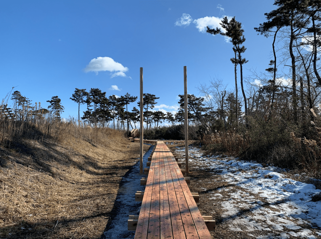 In 2022, as part of Sendai in Progress, a hexagonal observation tower was erected between Chochingama Marsh and the Shinhama Furusato Forest. Due to pandemic restrictions, Kawamata directed the construction remotely. In keeping with this long-term project—initiated in response to the tsunami — Shinhama Tower was conceived to help reconnect people with the sea. By ascending its spiral staircase, visitors could experience a rare view of the sea horizon, visible beyond the seawall built after the earthquake
