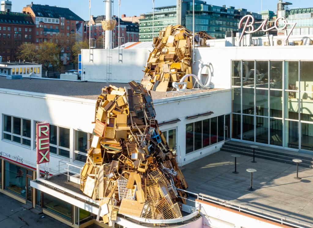 On the occasion of his solo show at Amos Rex, Kawamata created a monumental outdoor installation made from reclaimed furniture on the roof of the Lasipalatsi building, as well as a wooden nest structure on the courtyard chimney.