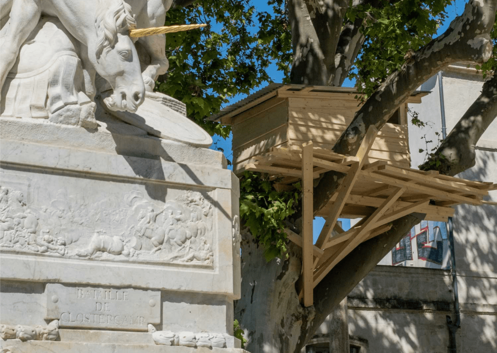 For this exhibition, commissioned by the GGL Foundation in partnership with the city of Montpellier, Kawamata created site-specific works in the inner courtyard of the Hôtel Richer de Belleval and four tree huts on the centenary trees in Canourgue Square, the oldest square in Montpellier. Additionally, a selection of maquettes was on display in the foundation’s exhibition space.