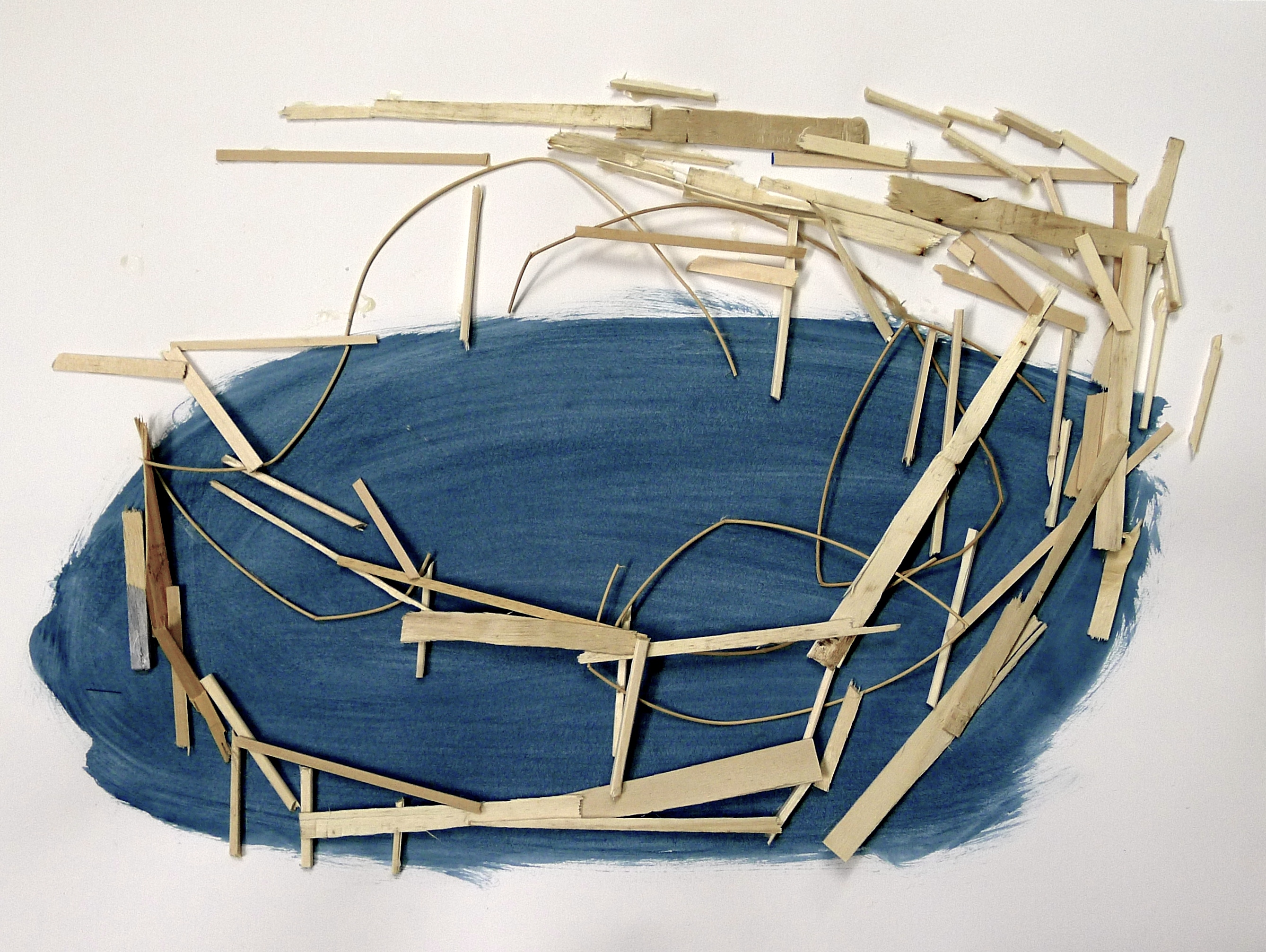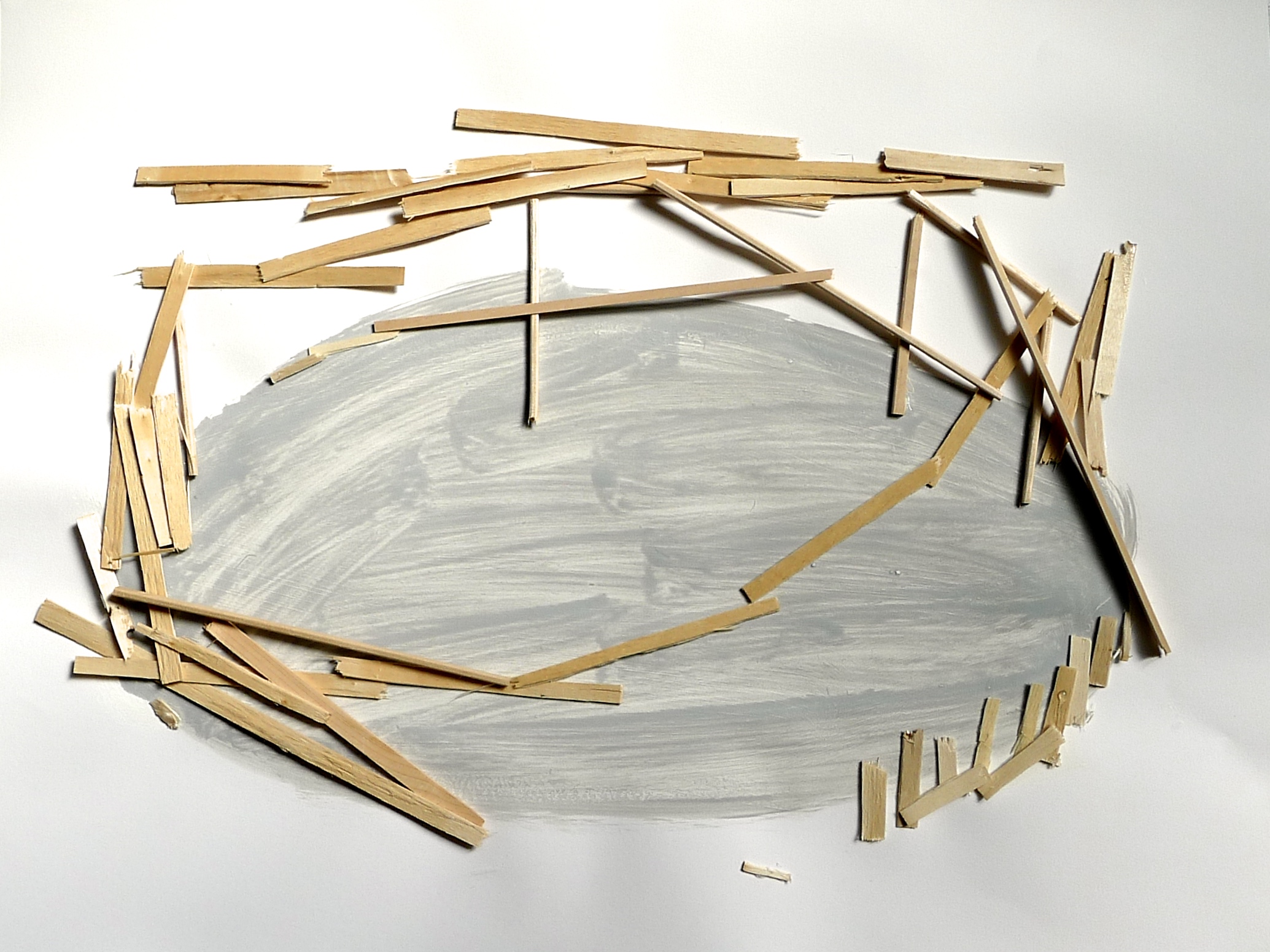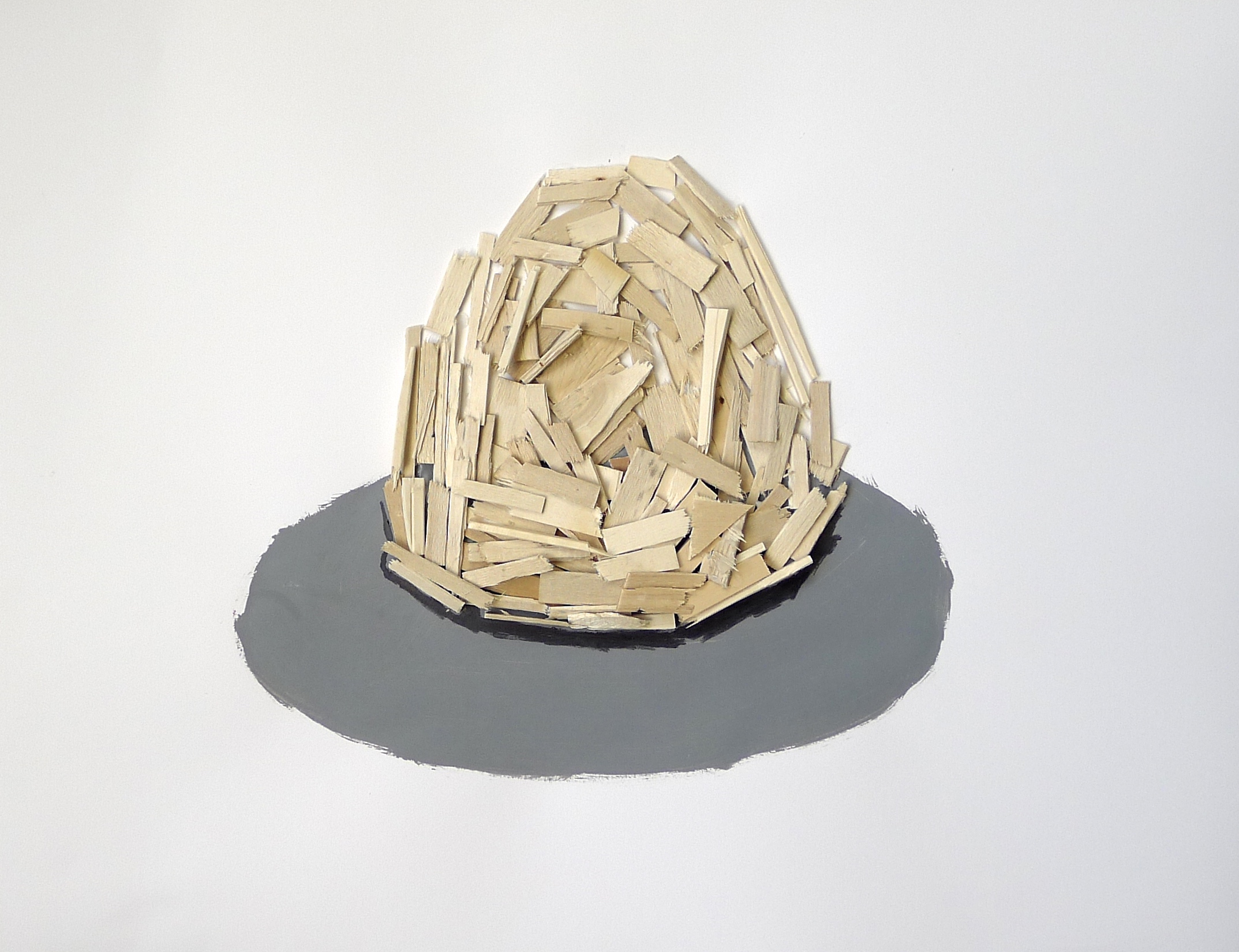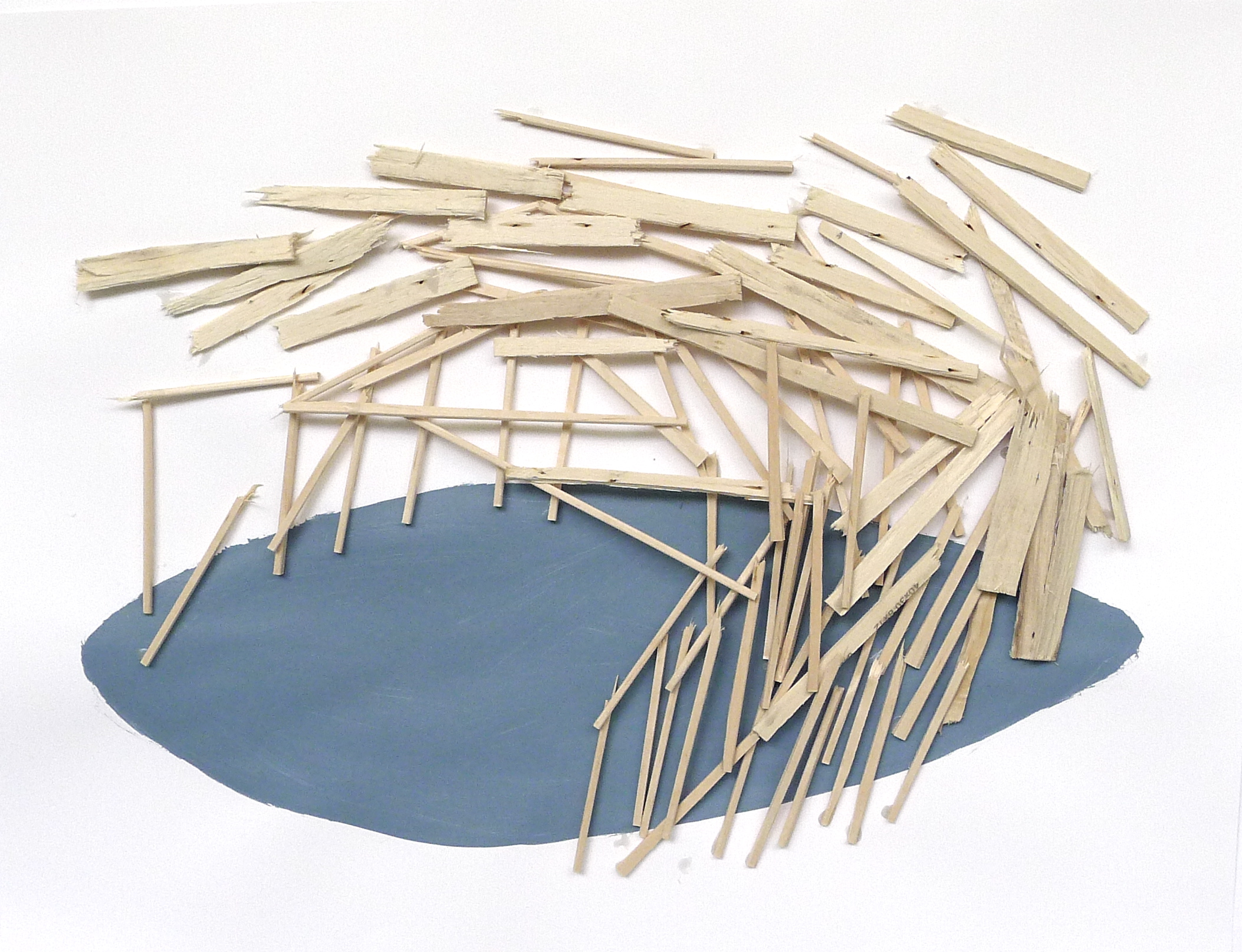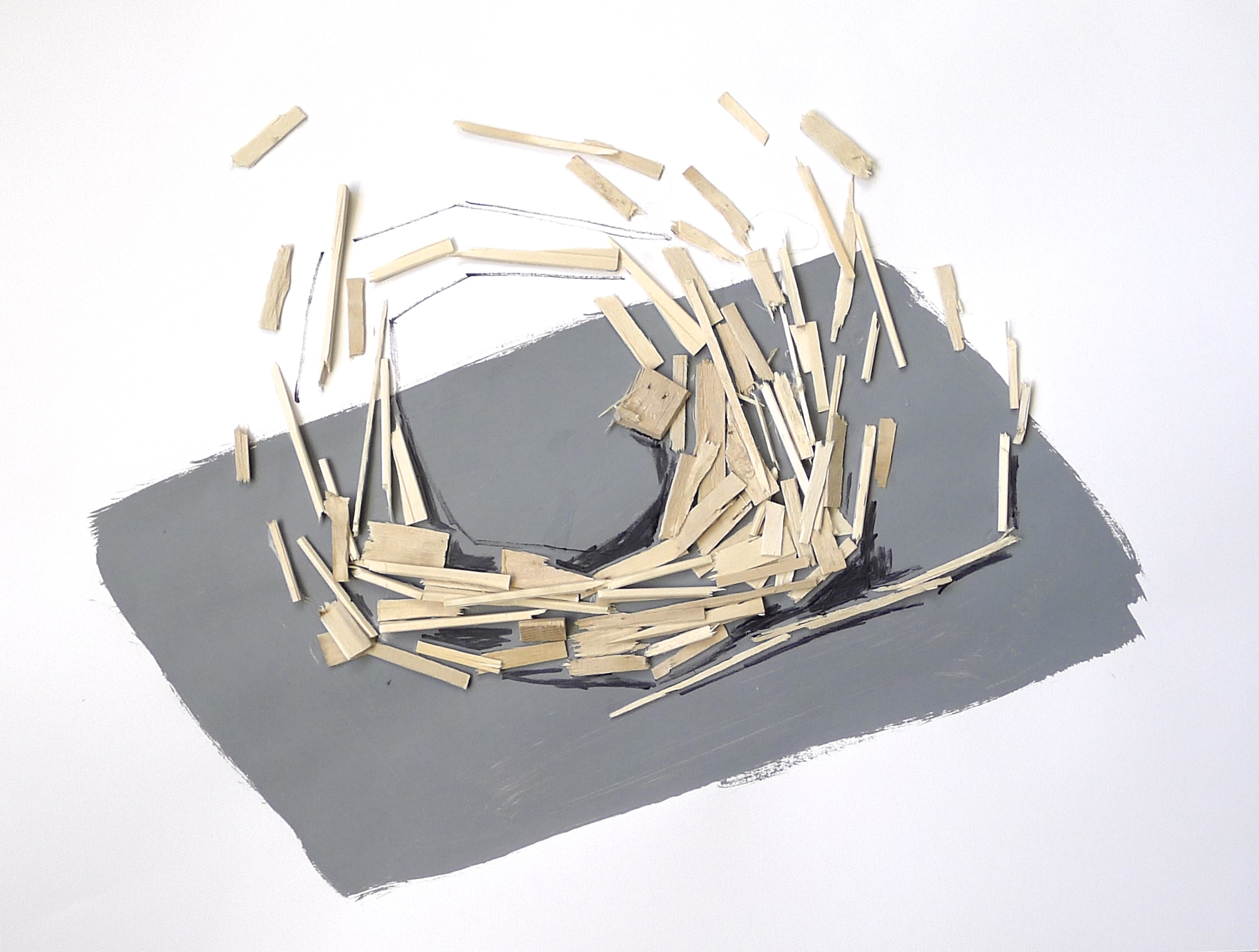 “The moment that triggered my series of Site Sketches was putting some leftover acrylic paint on a white sheet of paper while I was working on maquettes in my atelier. One day I began placing some wooden offcuts onto that paper, following the paint marks. These wooden chips were also discarded material from my maquette-making. (…) In my outdoor projects I have to remain sensitive to issues like the conditions at specific locations, structural integrity, and the safety of the audience. The advantage of Site Sketches is that I can disregard all of these things and develop freely on the paper, and the use of colors and materials gives rise to coincidental combinations. It is as though I am increasing the stock of my imagination. And they can also function as experimental spaces to see what and how I can build up through coincidence.”