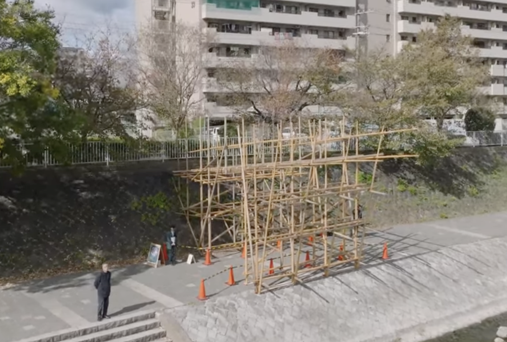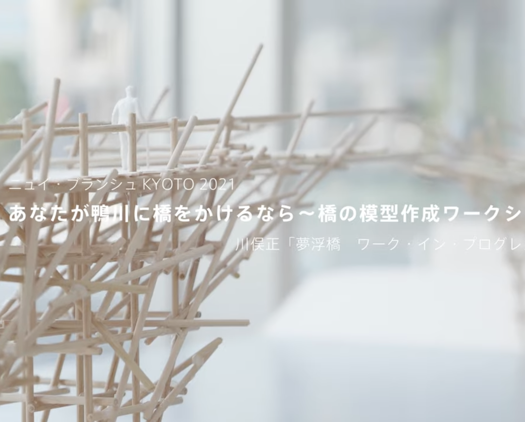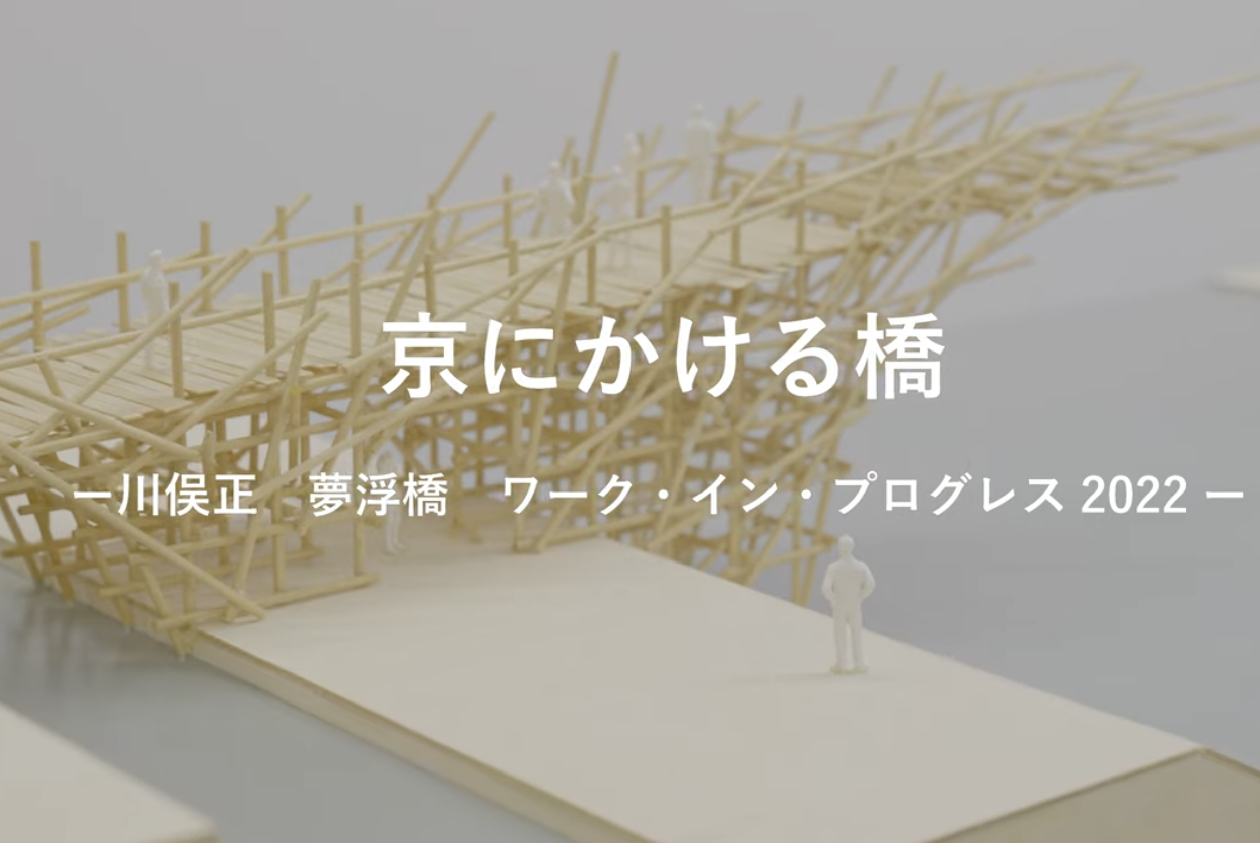 This video documents the development of Tadashi Kawamata’s project for Nuit Blanche Kyoto, Yume no Ukihashi – Work in Progress. It follows the construction process of the full-scale 1:1 bridge section prototype presented in 2021 at Shoyeido’s Karasuma site. The video also features the Yume no Ukihashi (2020) model, originally unveiled in the exhibition “Landscape by the Waterfront” during Nuit Blanche Kyoto 2020 at the Kyoto Art Center.