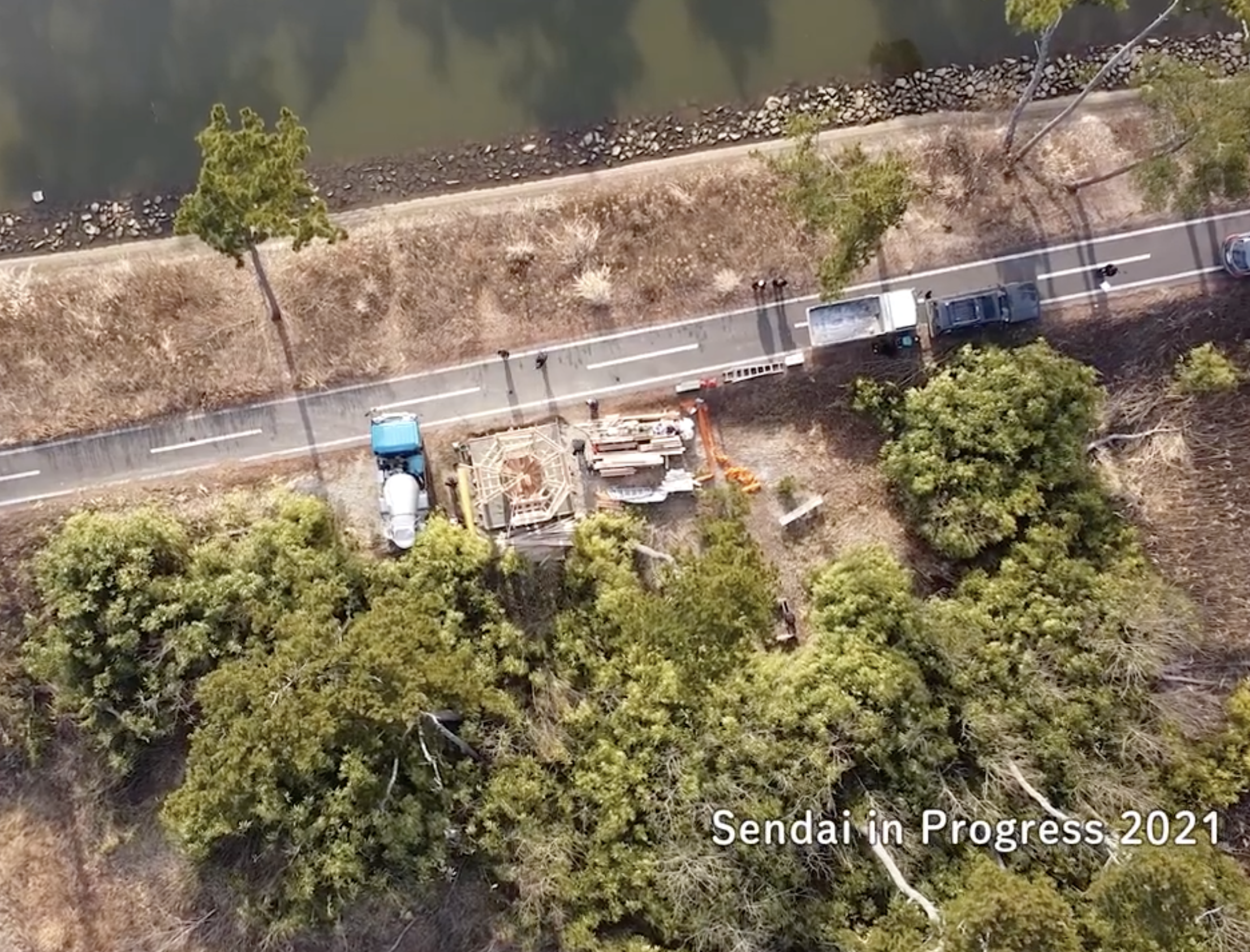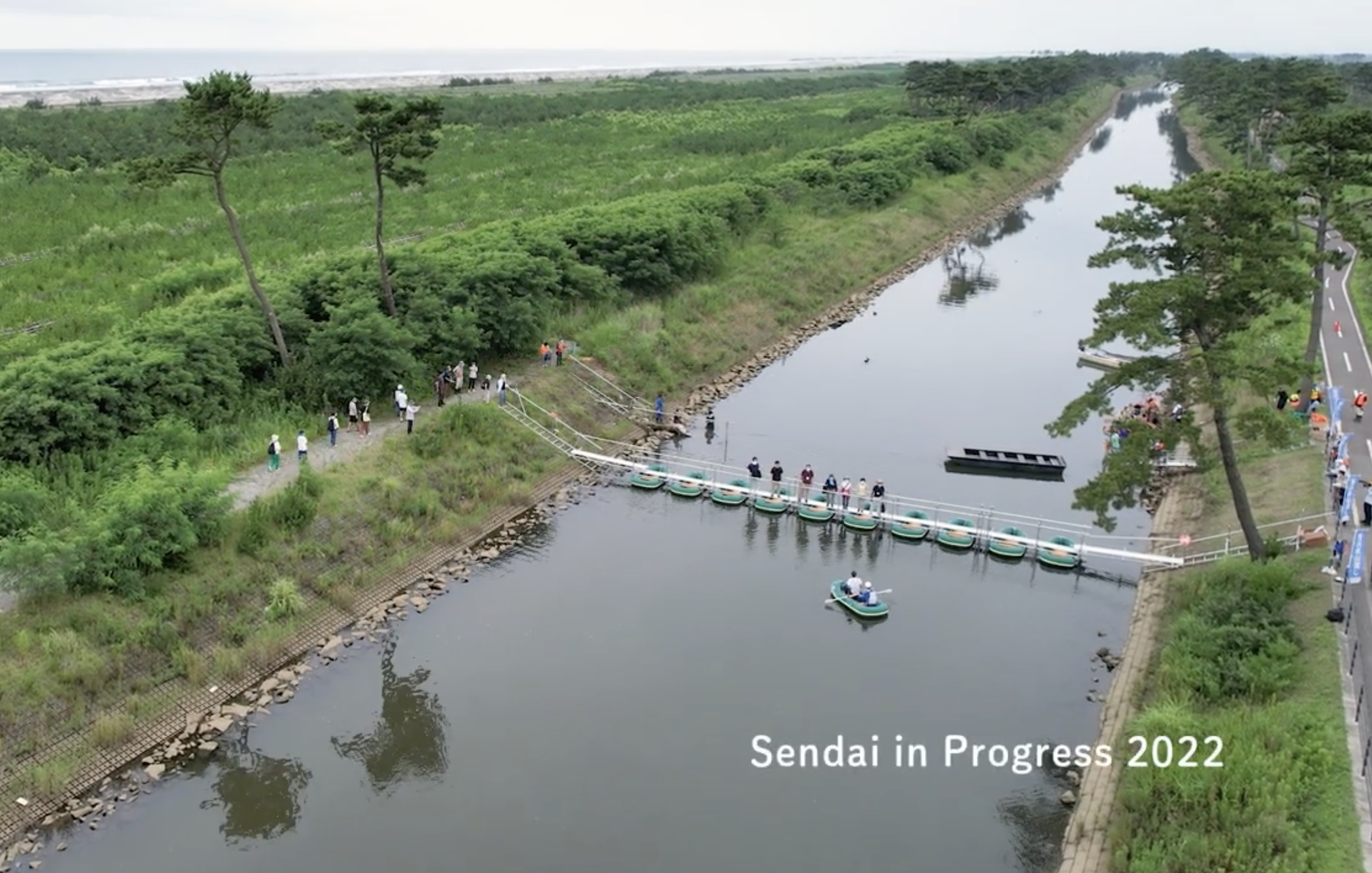 This video presents the second work of the Sendai In Progress: a wooden boardwalk along the seaward side of the Teizan Canal, leading visitors partway down to the beach.