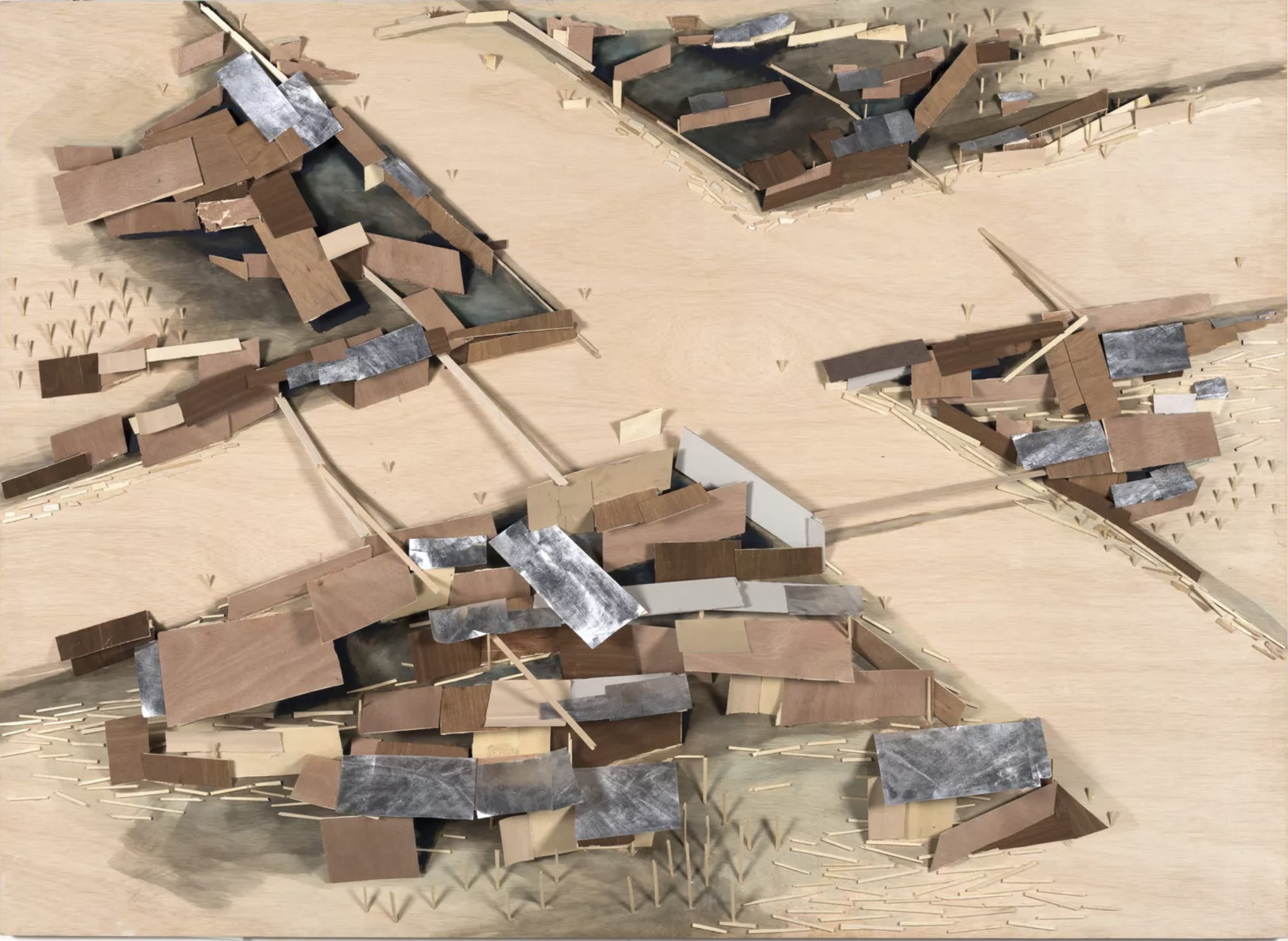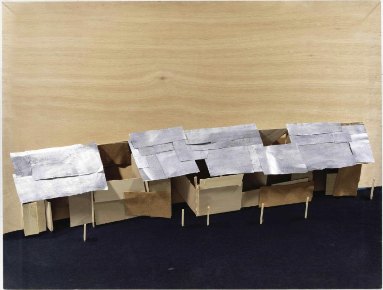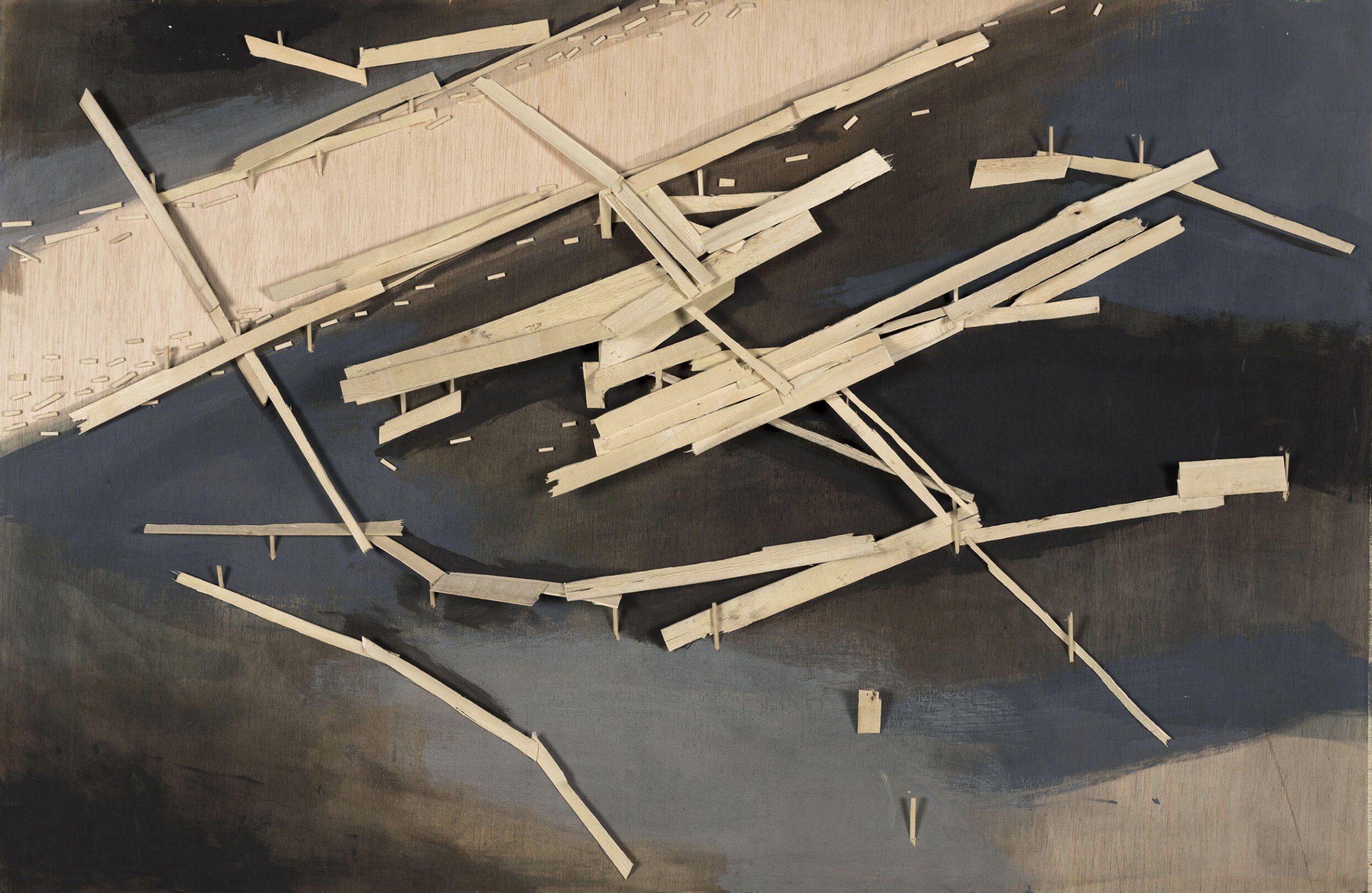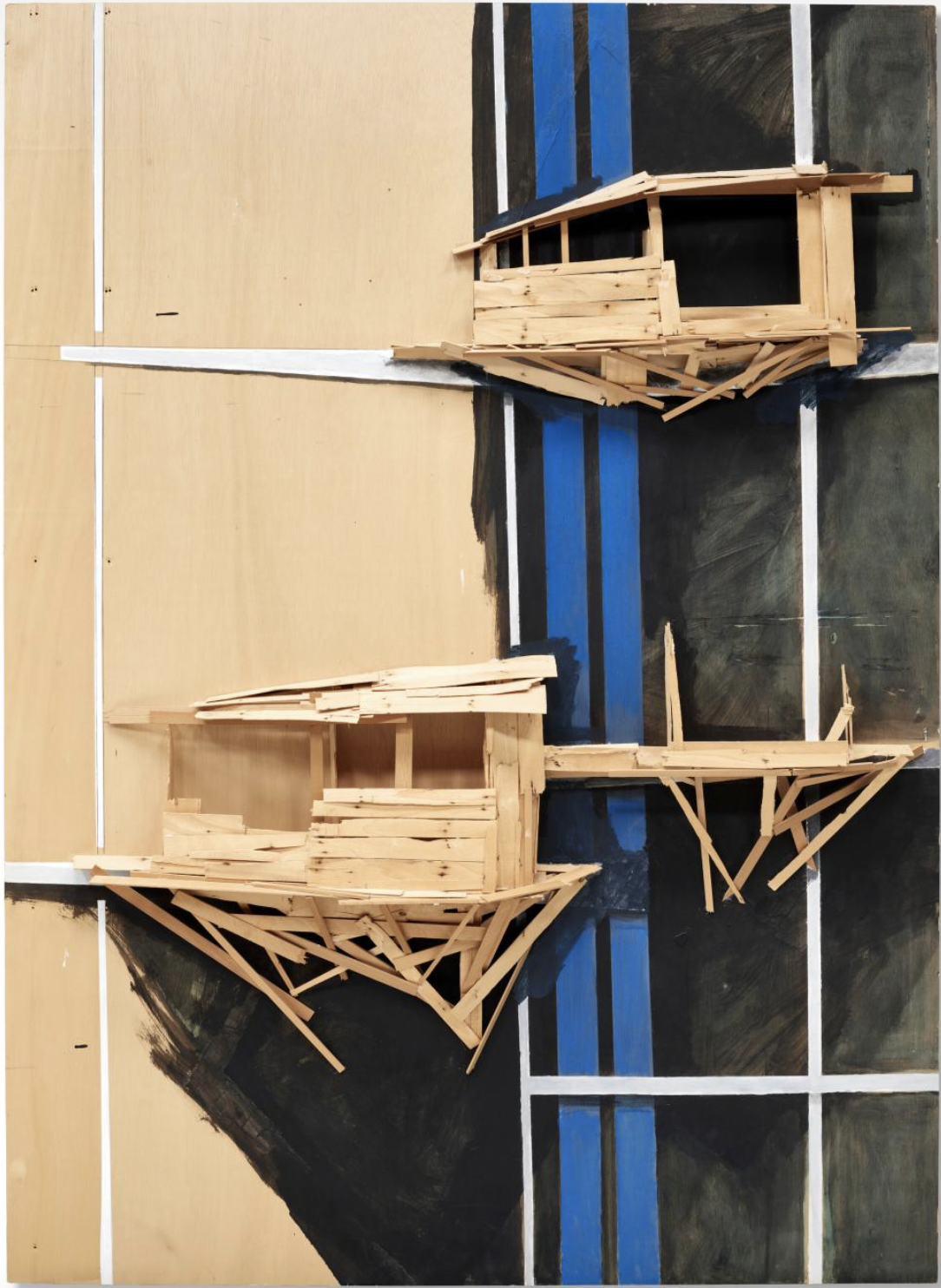 Kawamata began producing maquettes around 1980, during his years as a student at the Tokyo University of the Arts, and his fundamental method of gluing wooden pieces onto a painted board has remained unchanged ever since. He conceives these maquettes as works in their own right—autonomous objects whose creation offers him a solitary and reflective process, standing in contrast to his usual practice of participatory, in situ projects. Although some of them function as plans for upcoming installations—allowing him to visualize their spatial configuration—they extend far beyond the role of simple preparatory studies. At times, the artist creates maquettes without any specific project or location in mind, envisioning potential sites that may emerge in the future or exploring purely abstract formal possibilities.