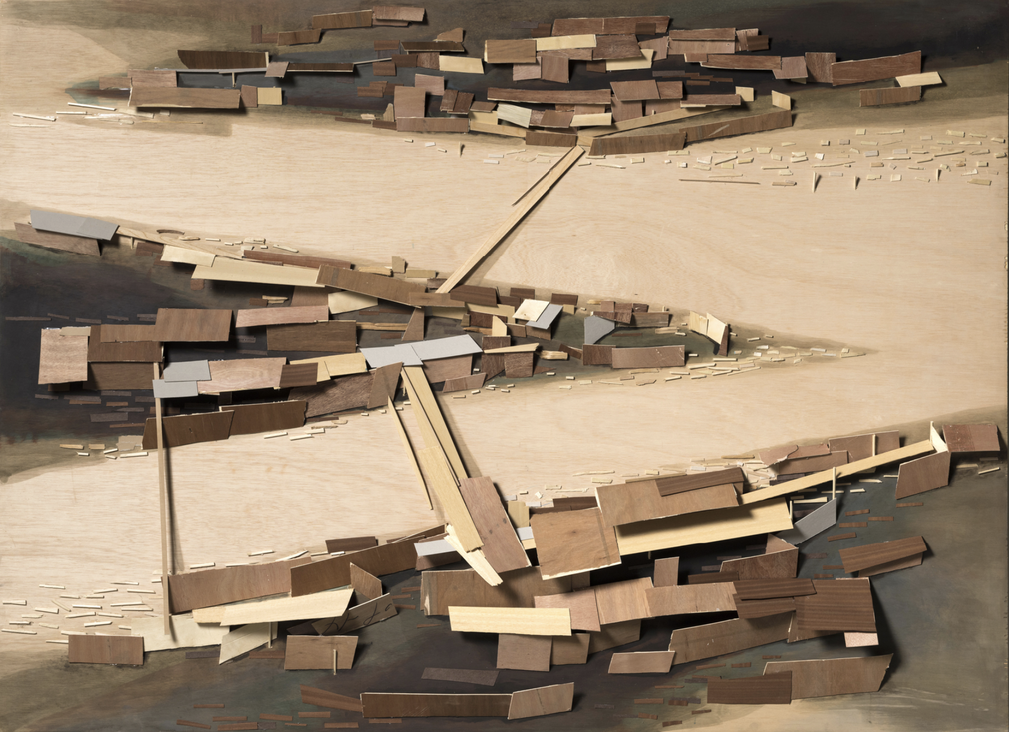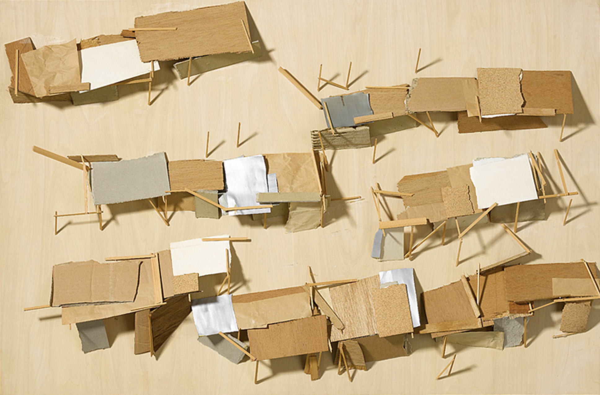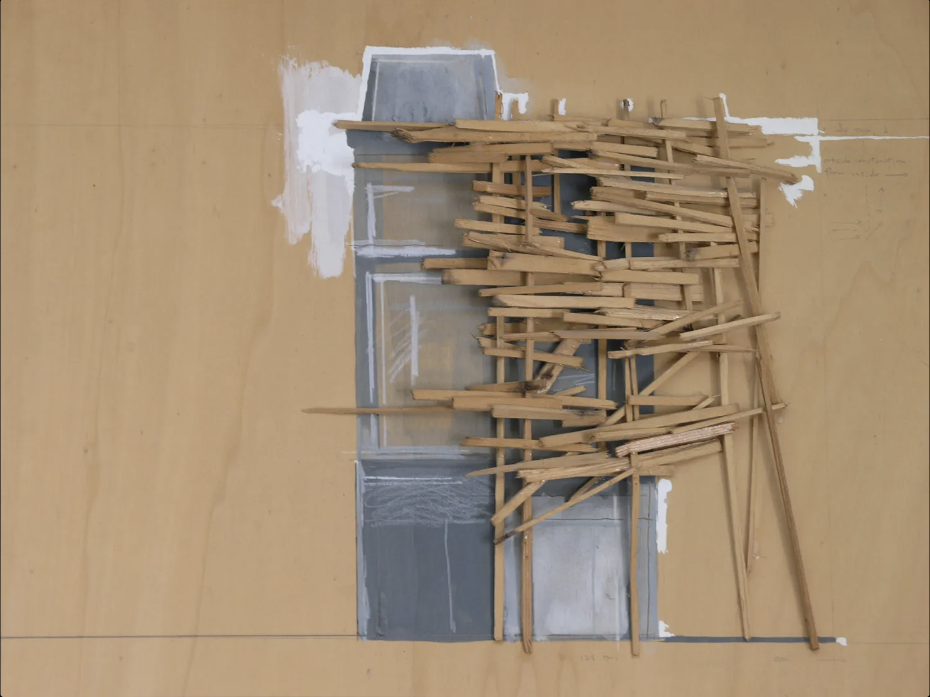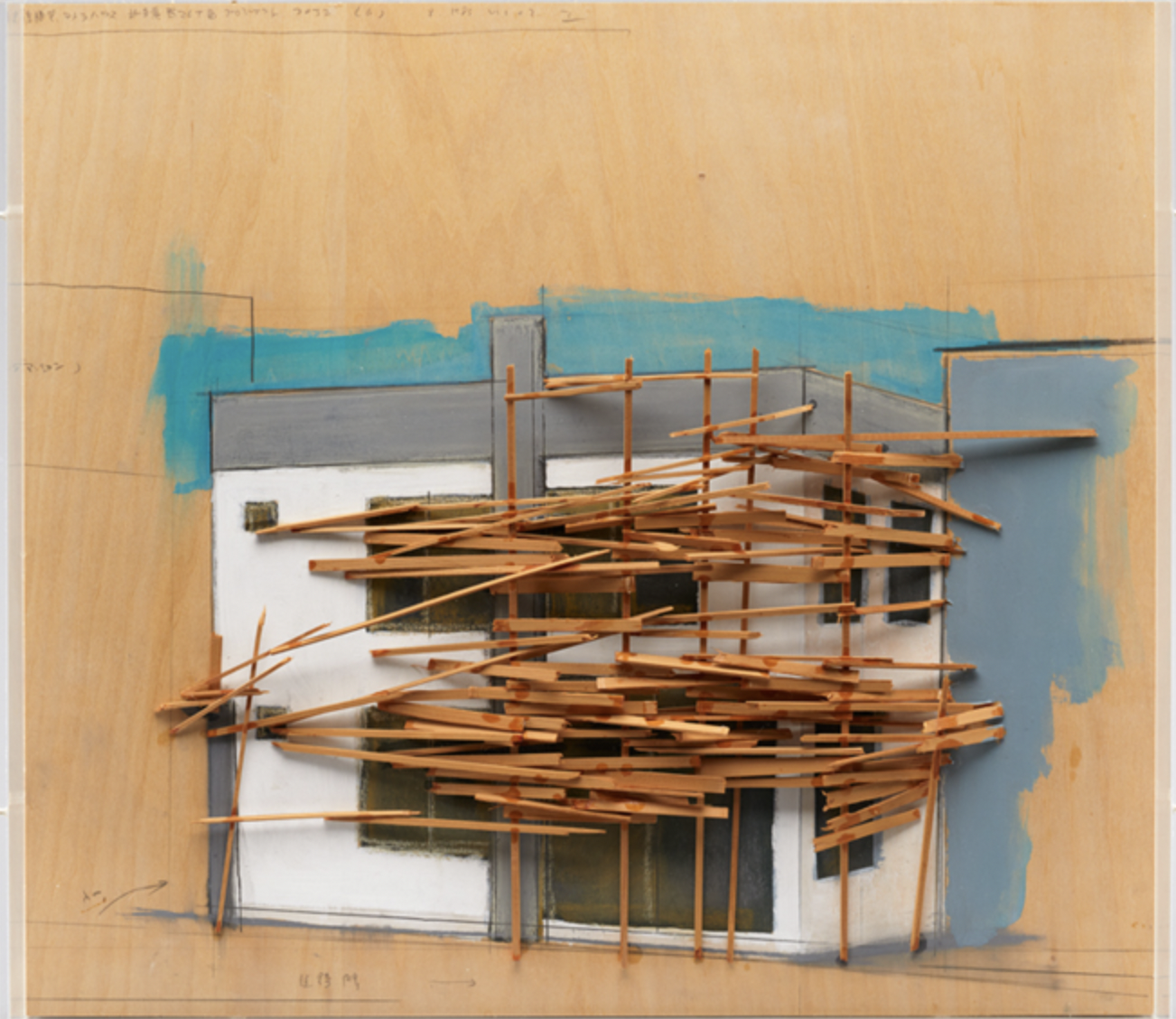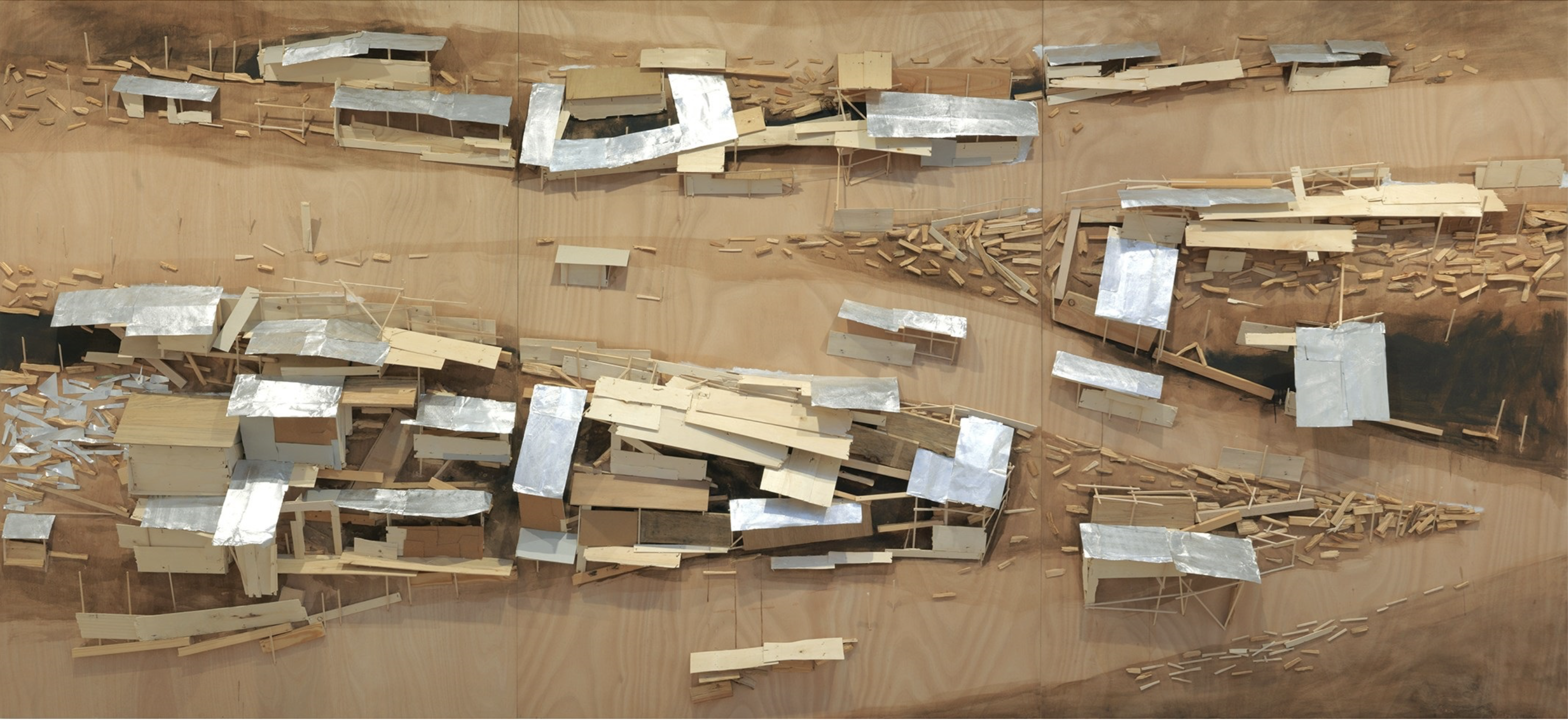 Kawamata began producing maquettes around 1980, during his years as a student at the Tokyo University of the Arts, and his fundamental method of gluing wooden pieces onto a painted board has remained unchanged ever since. He conceives these maquettes as works in their own right—autonomous objects whose creation offers him a solitary and reflective process, standing in contrast to his usual practice of participatory, in situ projects. Although some of them function as plans for upcoming installations—allowing him to visualize their spatial configuration—they extend far beyond the role of simple preparatory studies. At times, the artist creates maquettes without any specific project or location in mind, envisioning potential sites that may emerge in the future or exploring purely abstract formal possibilities.