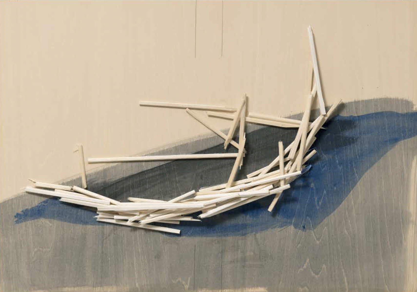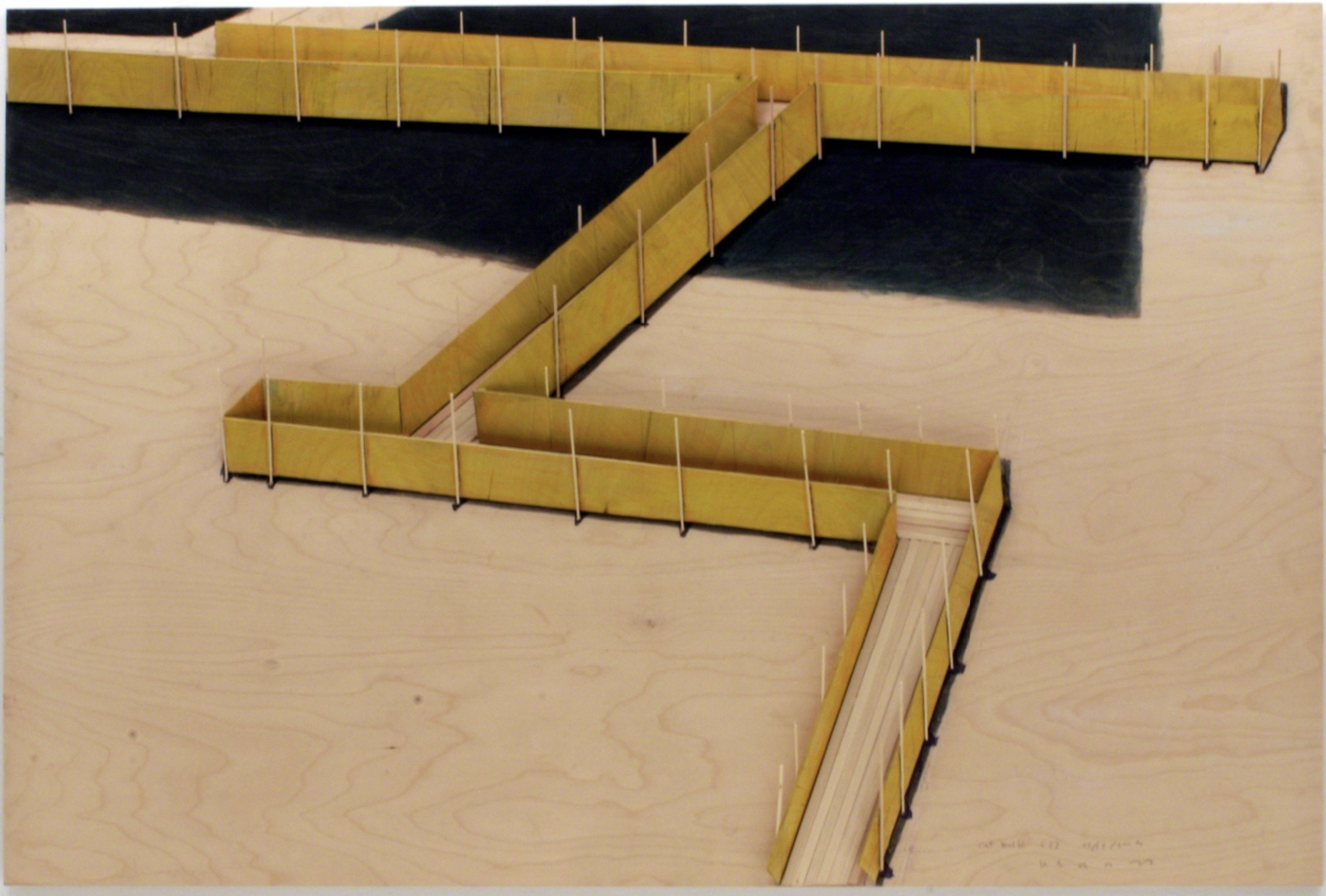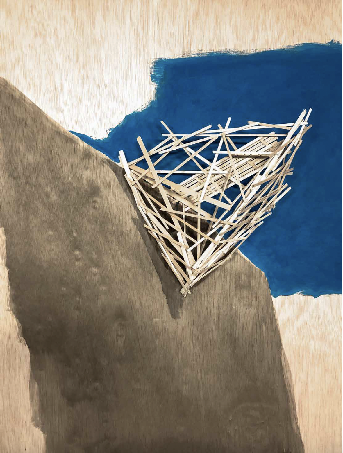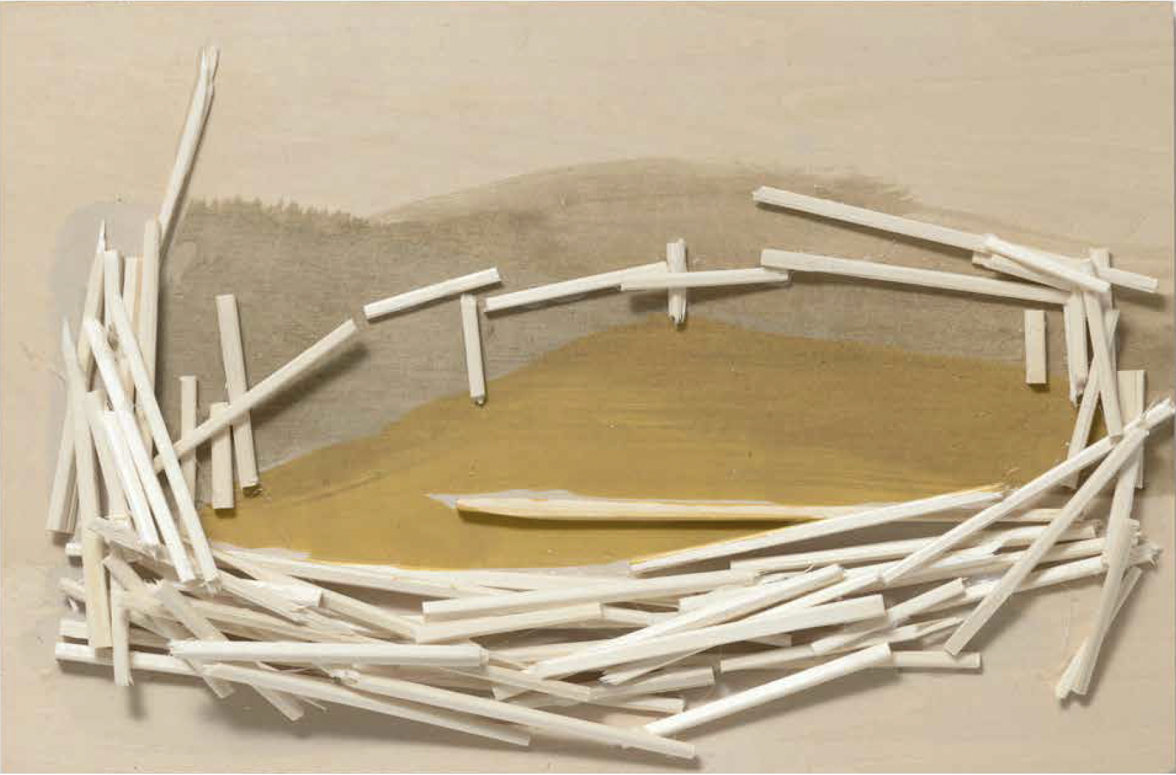 Kawamata began producing maquettes around 1980, during his years as a student at the Tokyo University of the Arts, and his fundamental method of gluing wooden pieces onto a painted board has remained unchanged ever since. He conceives these maquettes as works in their own right—autonomous objects whose creation offers him a solitary and reflective process, standing in contrast to his usual practice of participatory, in situ projects. Although some of them function as plans for upcoming installations—allowing him to visualize their spatial configuration—they extend far beyond the role of simple preparatory studies. At times, the artist creates maquettes without any specific project or location in mind, envisioning potential sites that may emerge in the future or exploring purely abstract formal possibilities.