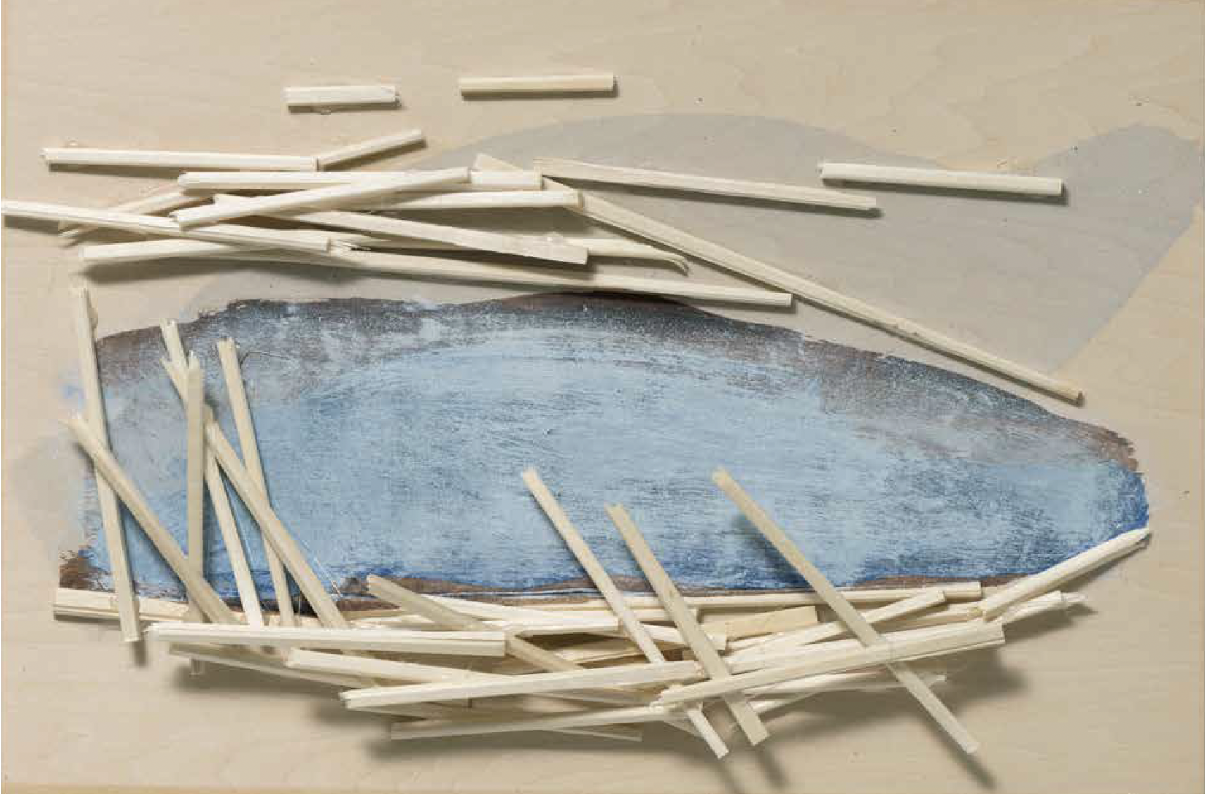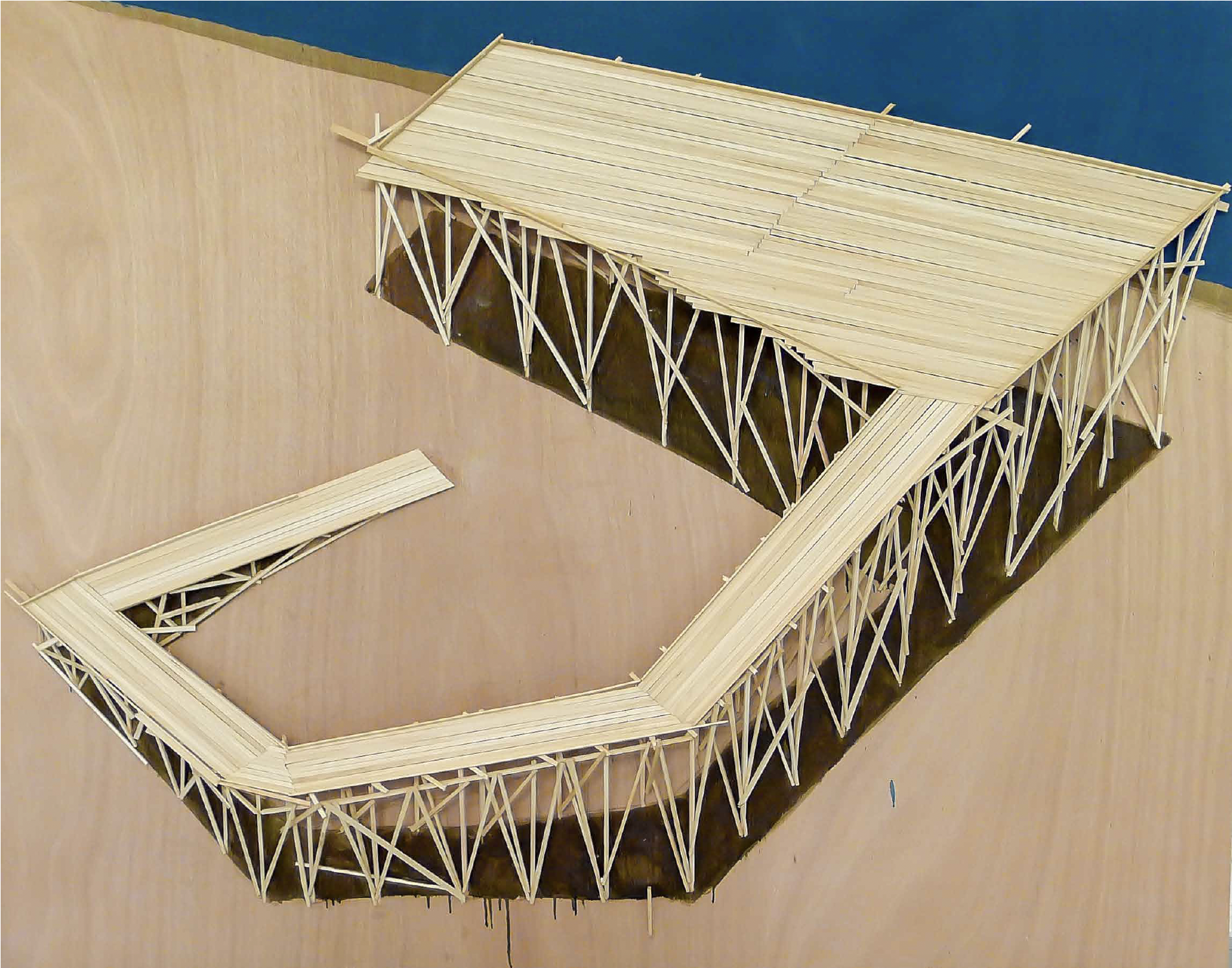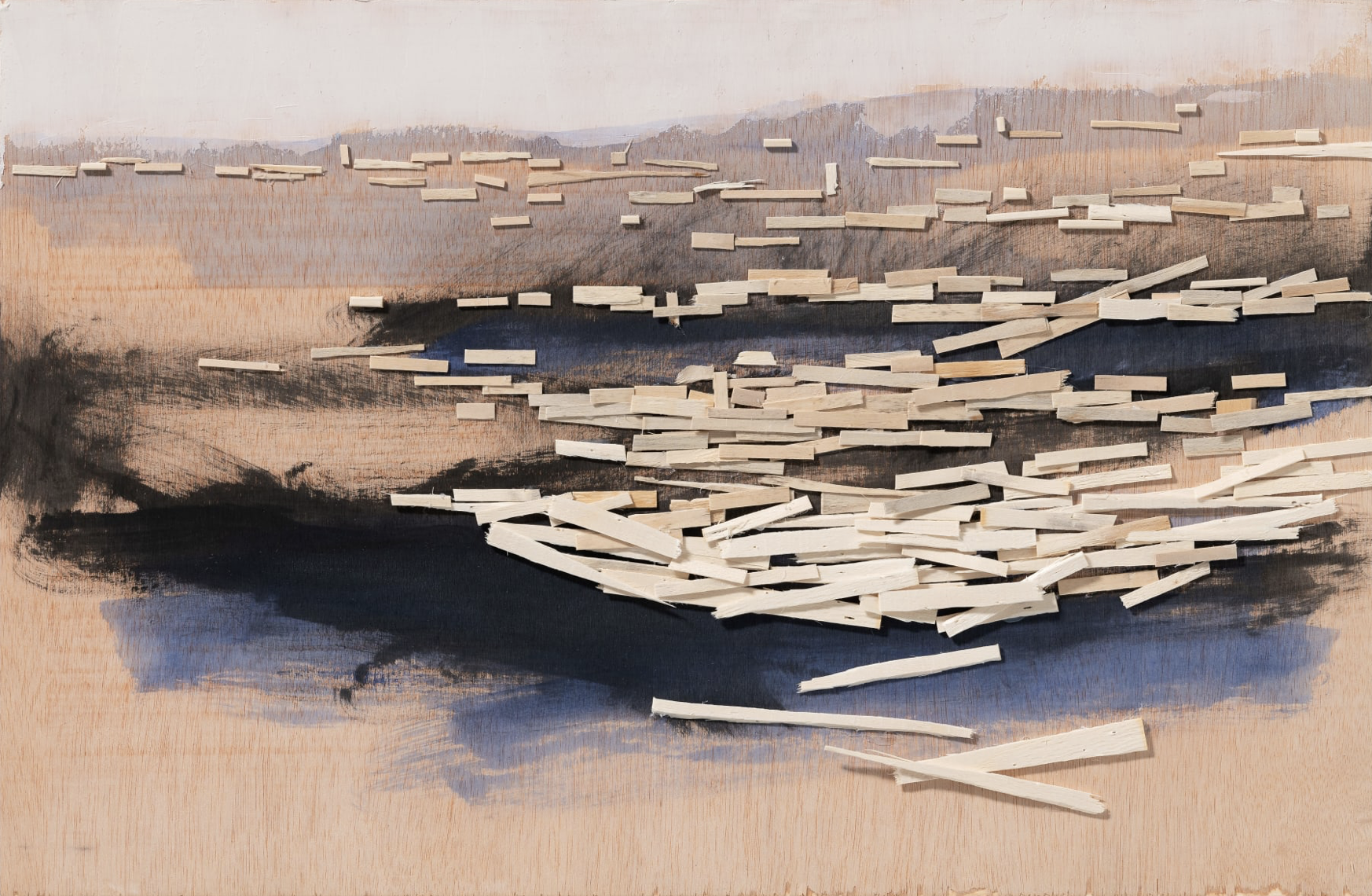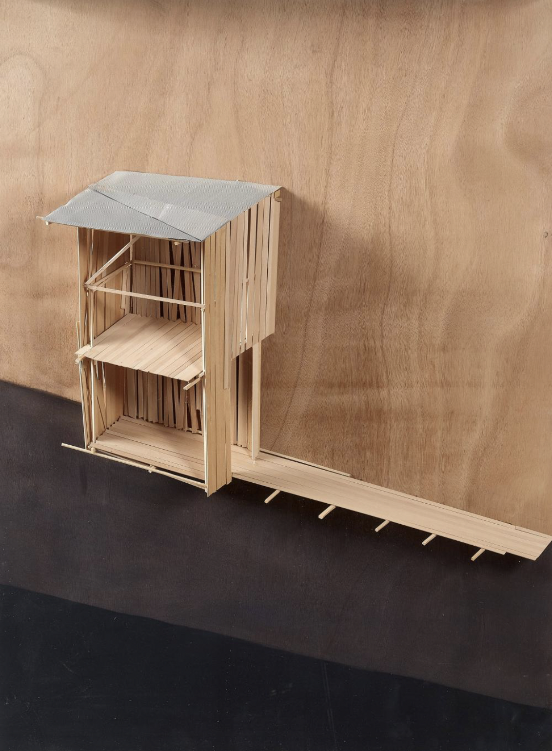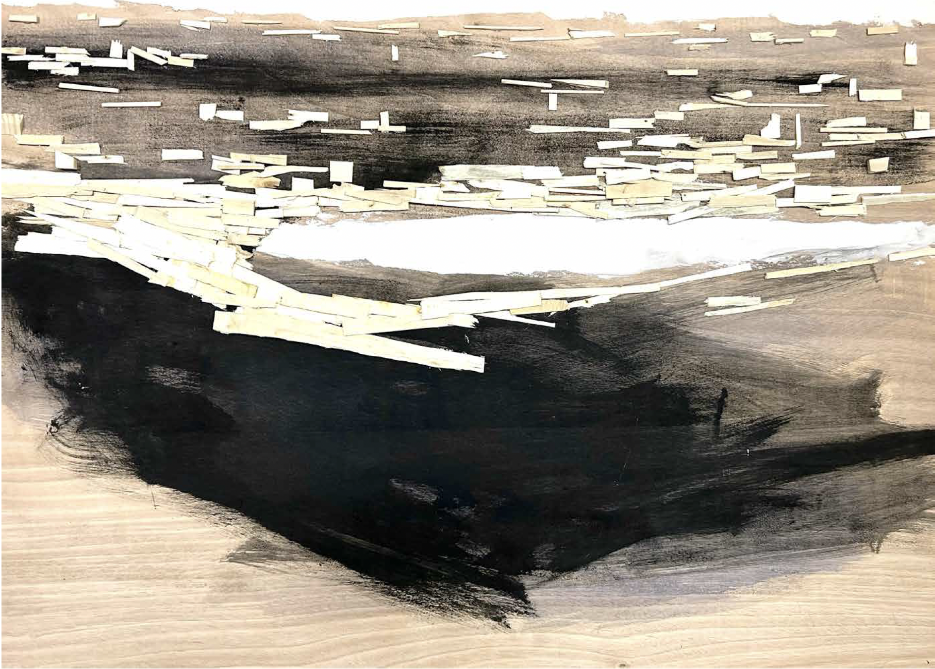 Kawamata began producing maquettes around 1980, during his years as a student at the Tokyo University of the Arts, and his fundamental method of gluing wooden pieces onto a painted board has remained unchanged ever since. He conceives these maquettes as works in their own right—autonomous objects whose creation offers him a solitary and reflective process, standing in contrast to his usual practice of participatory, in situ projects. Although some of them function as plans for upcoming installations—allowing him to visualize their spatial configuration—they extend far beyond the role of simple preparatory studies. At times, the artist creates maquettes without any specific project or location in mind, envisioning potential sites that may emerge in the future or exploring purely abstract formal possibilities.
