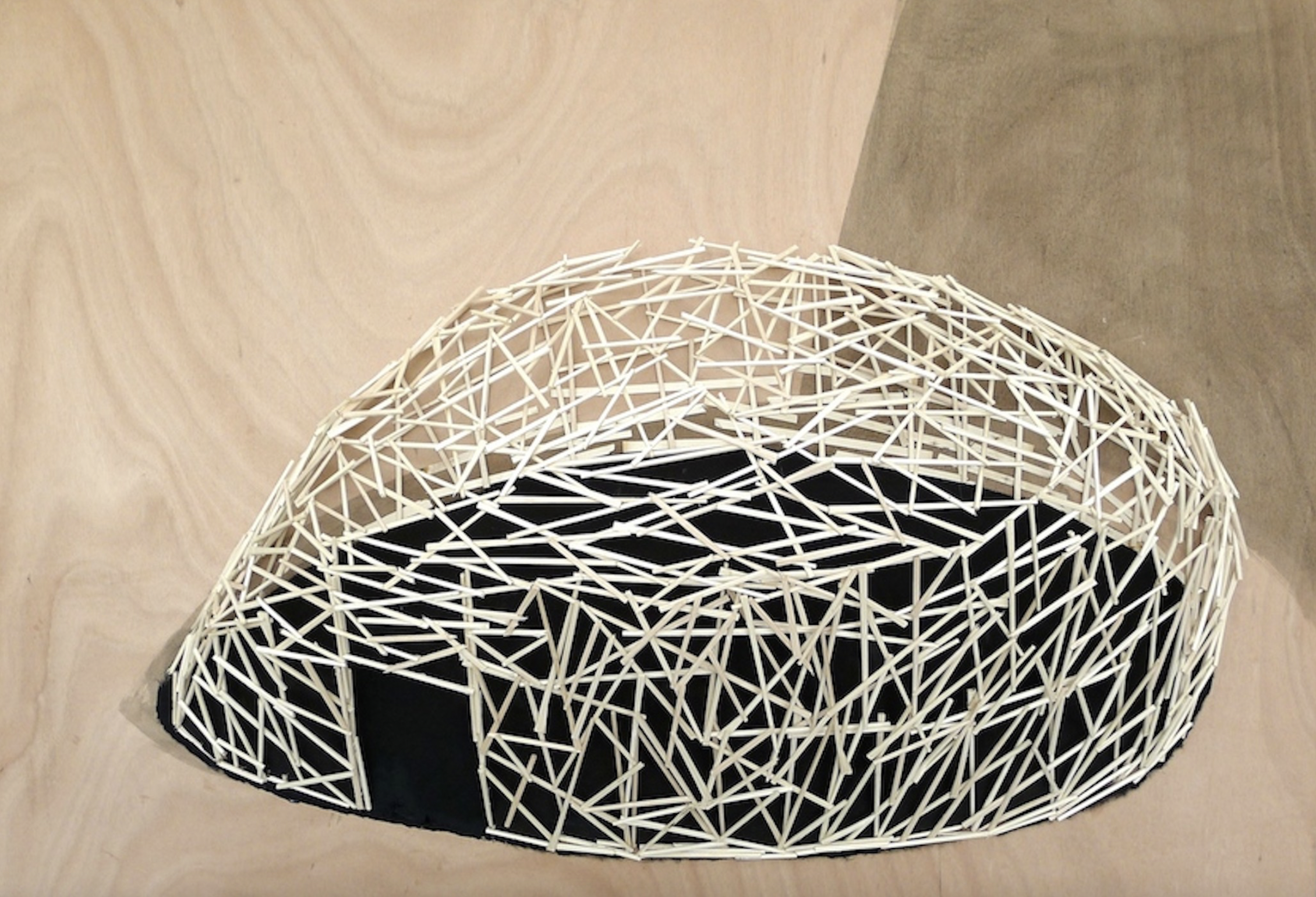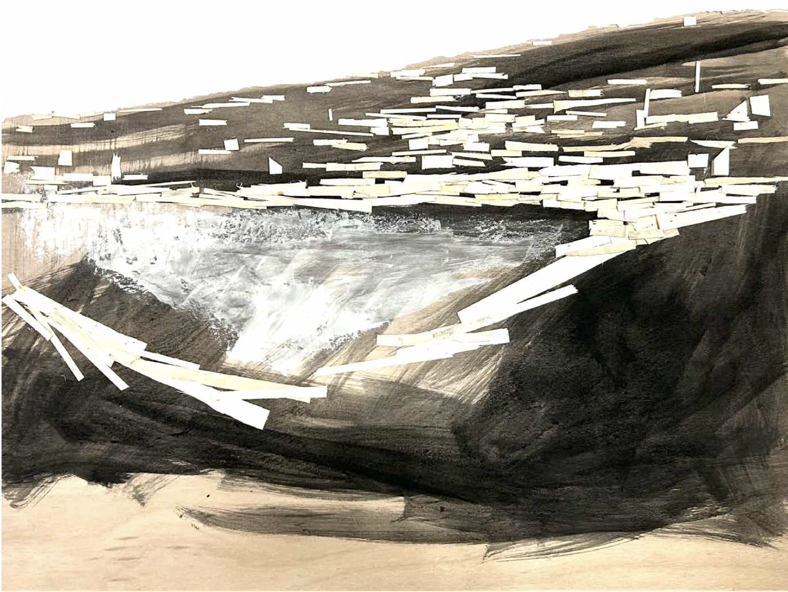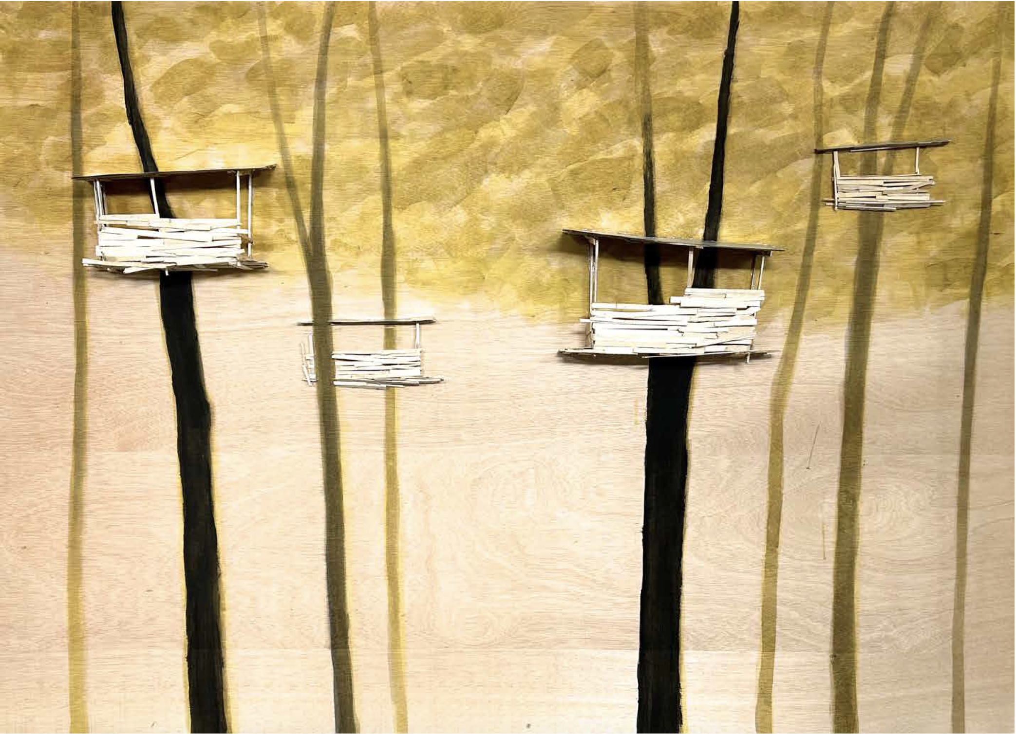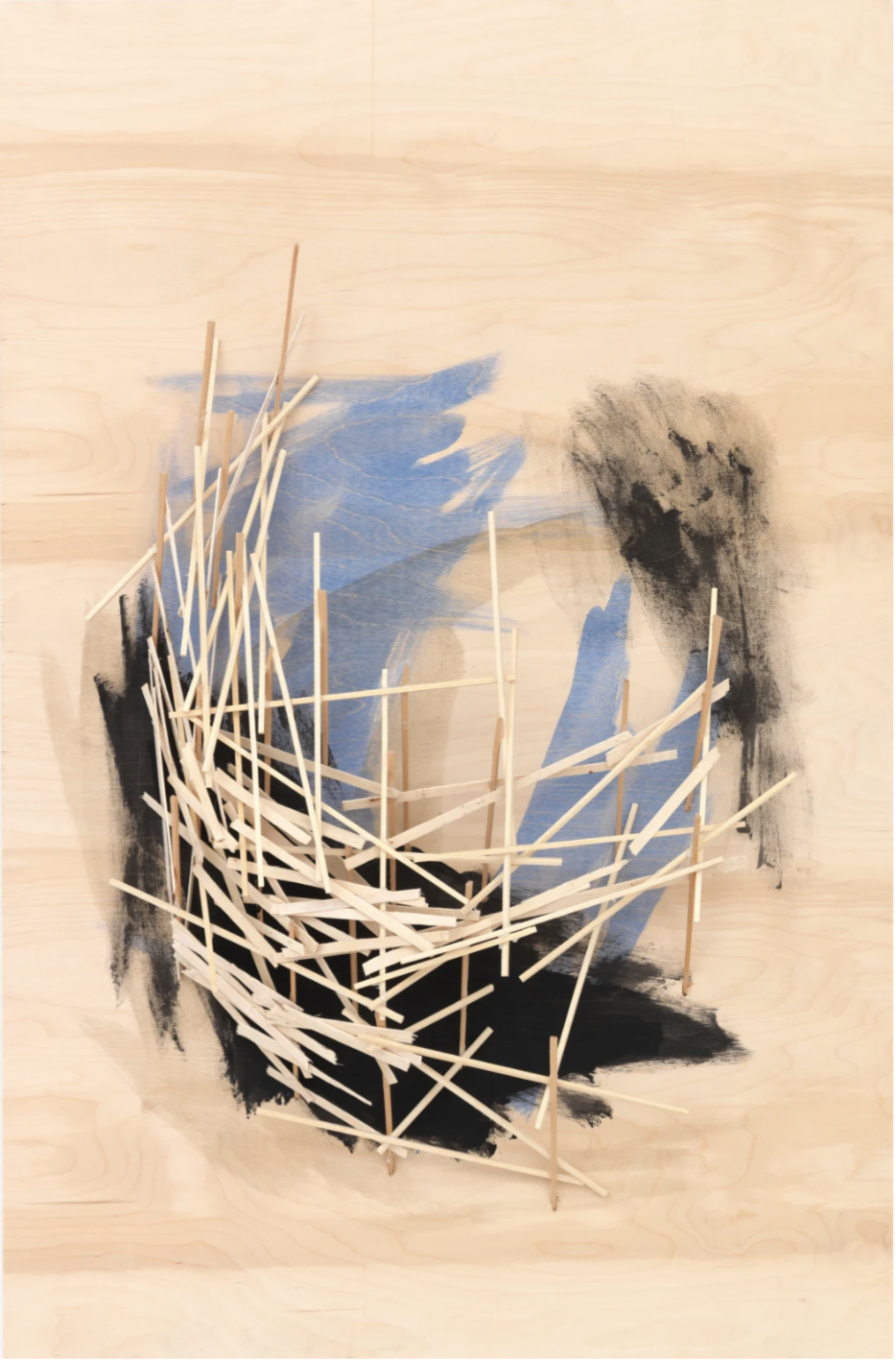 Kawamata began producing maquettes around 1980, during his years as a student at the Tokyo University of the Arts, and his fundamental method of gluing wooden pieces onto a painted board has remained unchanged ever since. He conceives these maquettes as works in their own right—autonomous objects whose creation offers him a solitary and reflective process, standing in contrast to his usual practice of participatory, in situ projects. Although some of them function as plans for upcoming installations—allowing him to visualize their spatial configuration—they extend far beyond the role of simple preparatory studies. At times, the artist creates maquettes without any specific project or location in mind, envisioning potential sites that may emerge in the future or exploring purely abstract formal possibilities.