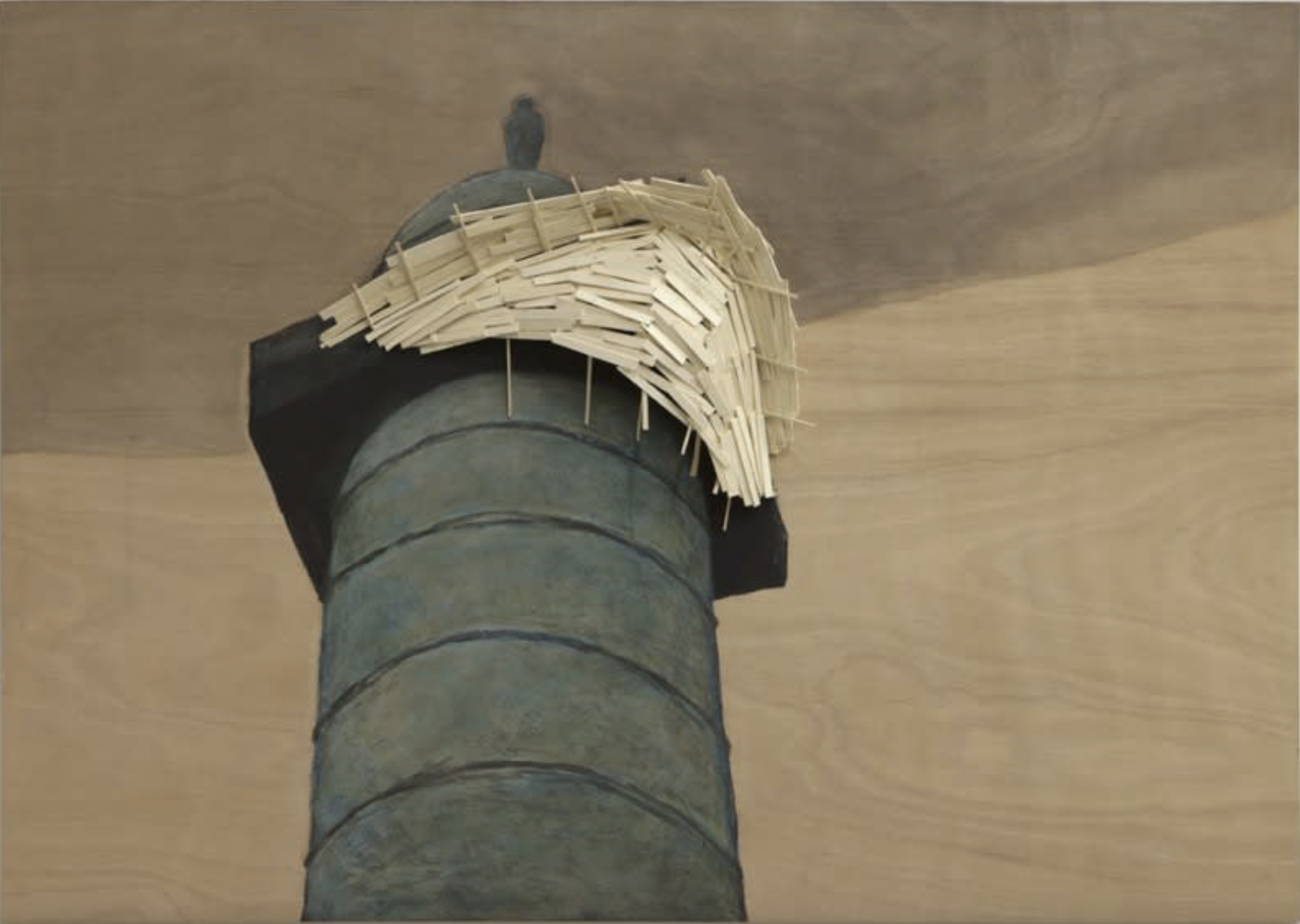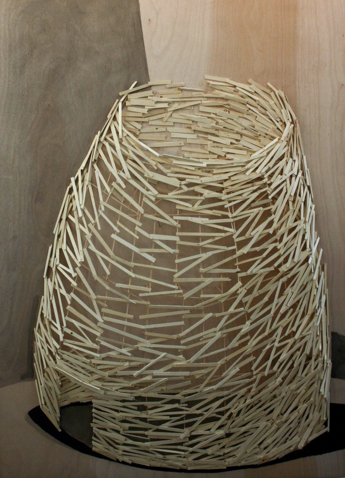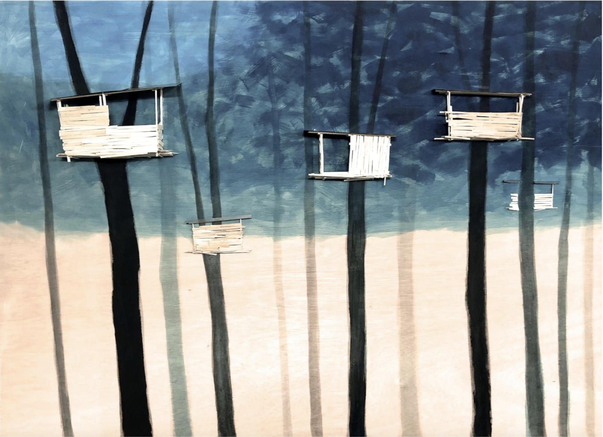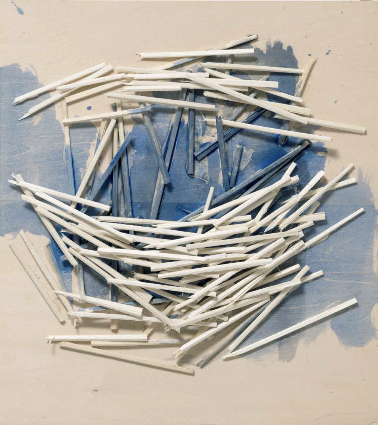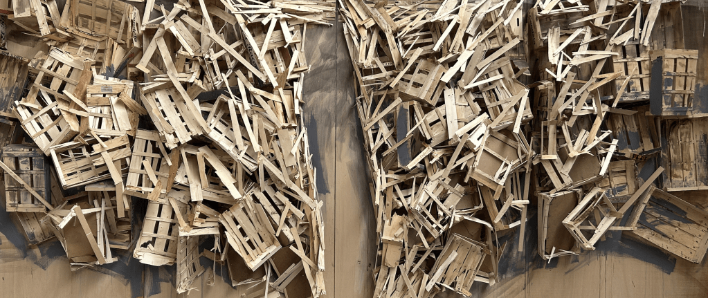 Kawamata began producing maquettes around 1980, during his years as a student at the Tokyo University of the Arts, and his fundamental method of gluing wooden pieces onto a painted board has remained unchanged ever since. He conceives these maquettes as works in their own right—autonomous objects whose creation offers him a solitary and reflective process, standing in contrast to his usual practice of participatory, in situ projects. Although some of them function as plans for upcoming installations—allowing him to visualize their spatial configuration—they extend far beyond the role of simple preparatory studies. At times, the artist creates maquettes without any specific project or location in mind, envisioning potential sites that may emerge in the future or exploring purely abstract formal possibilities.