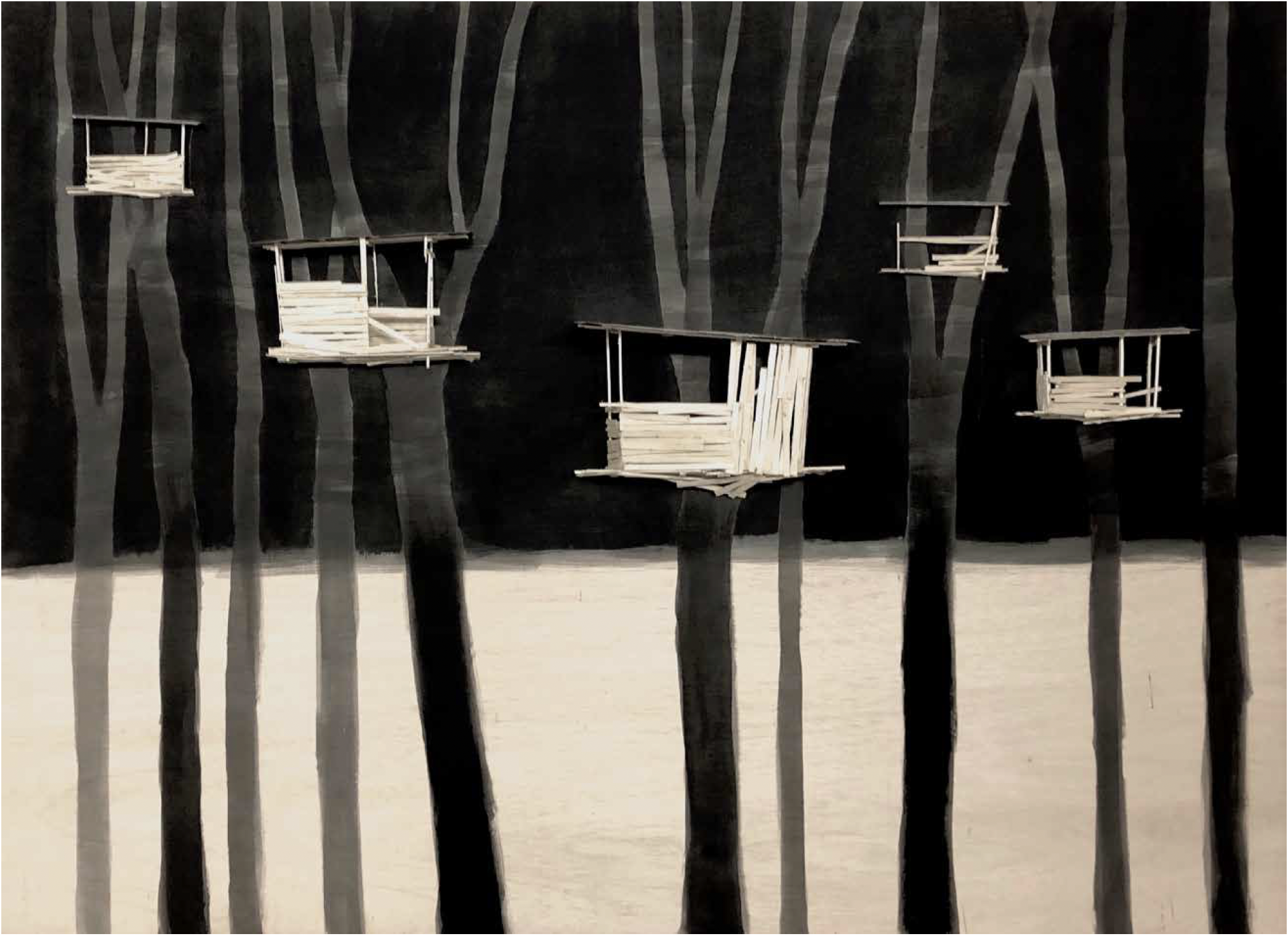 While not all maquettes belong to a specific project or defined series, several recurring themes run through Kawamata’s production, ranging from – though not exhaustively — Favela, Tsunami, Destruction, Tree Hut, and Tsumari, to the more abstract and recent Landscape works.