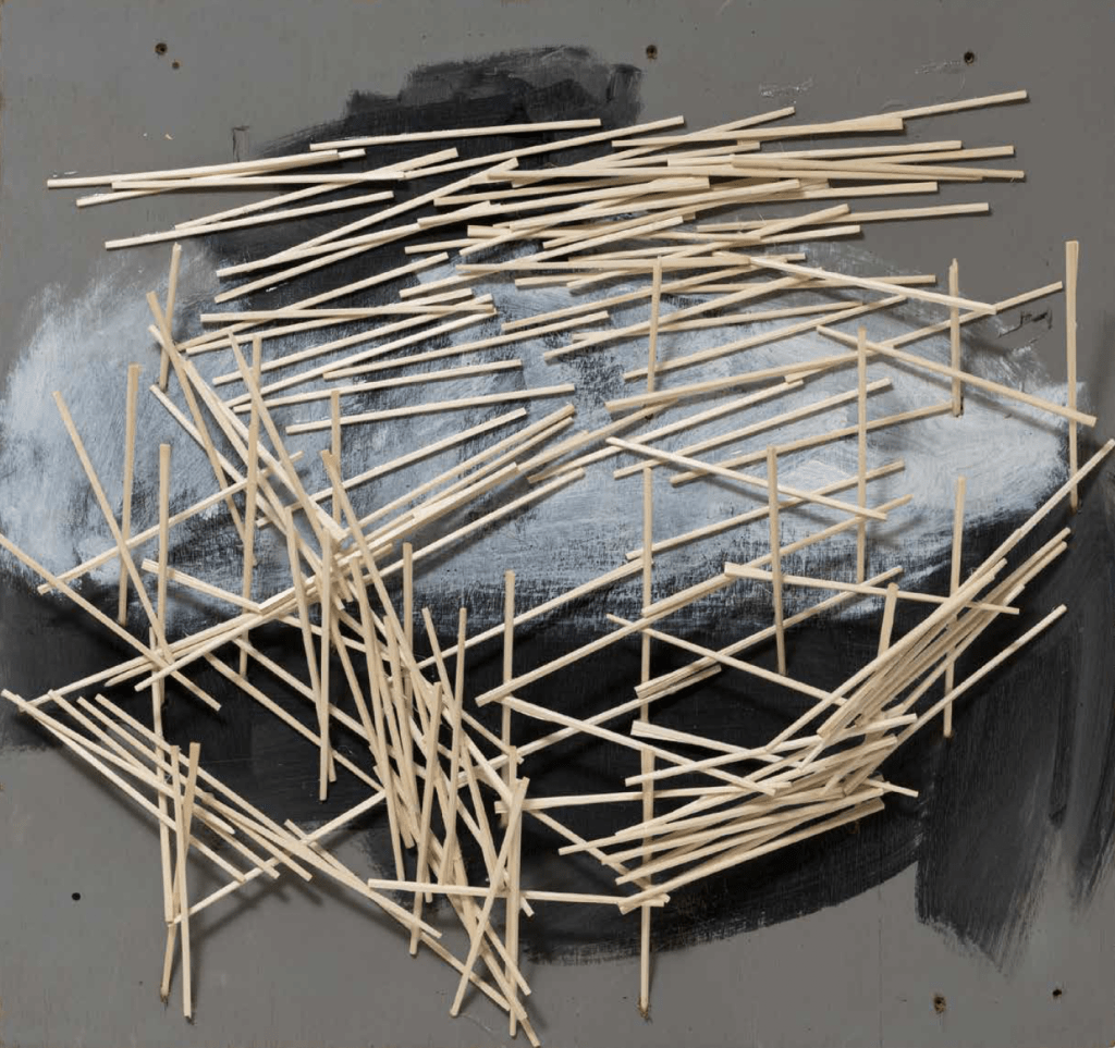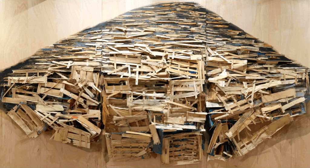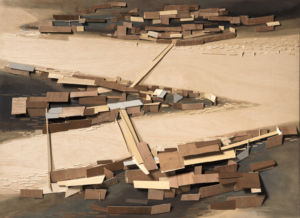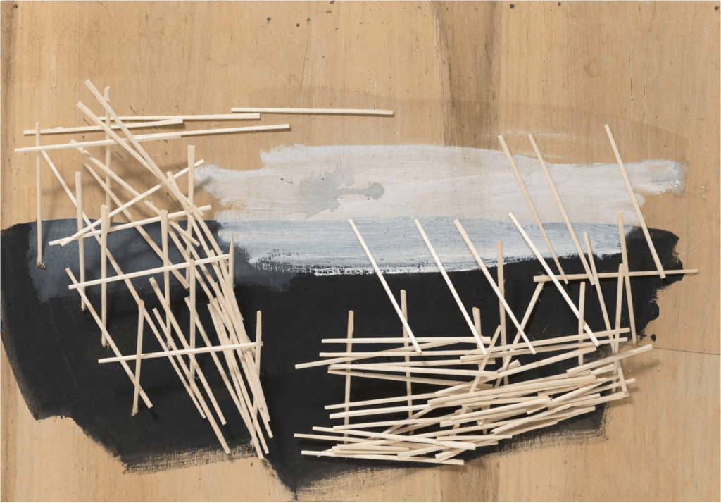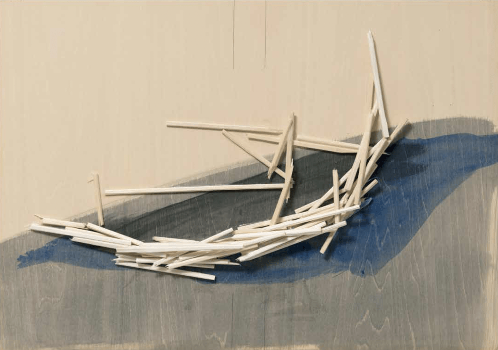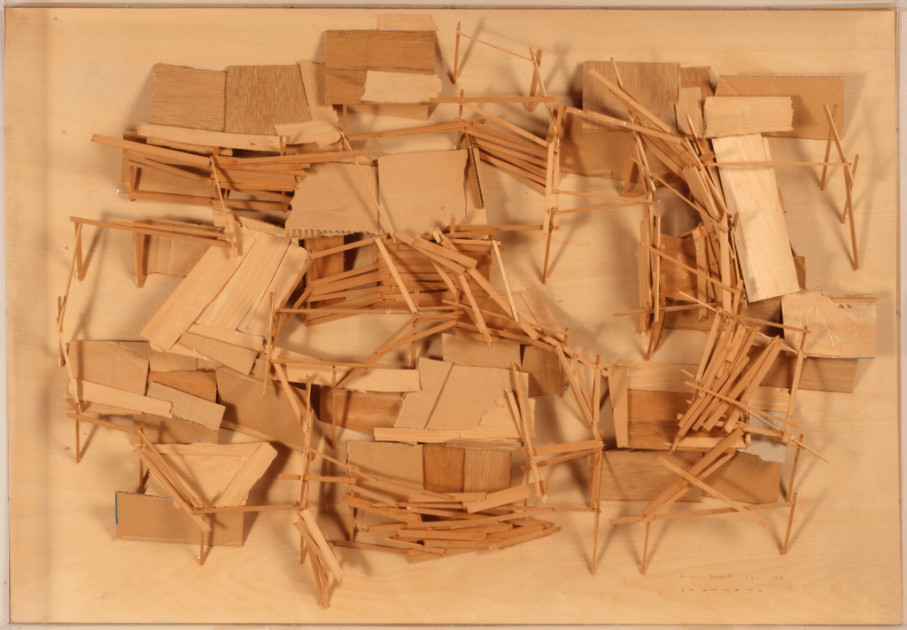 Kawamata began producing maquettes around 1980, during his years as a student at the Tokyo University of the Arts, and his fundamental method of gluing wooden pieces onto a painted board has remained unchanged ever since. He conceives these maquettes as works in their own right—autonomous objects whose creation offers him a solitary and reflective process, standing in contrast to his usual practice of participatory, in situ projects. Although some of them function as plans for upcoming installations—allowing him to visualize their spatial configuration—they extend far beyond the role of simple preparatory studies. At times, the artist creates maquettes without any specific project or location in mind, envisioning potential sites that may emerge in the future or exploring purely abstract formal possibilities.