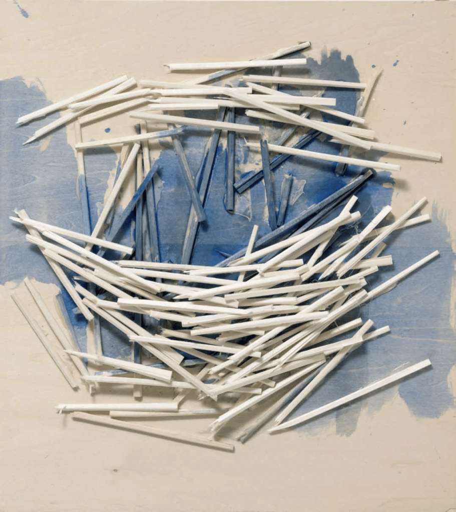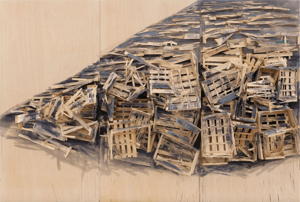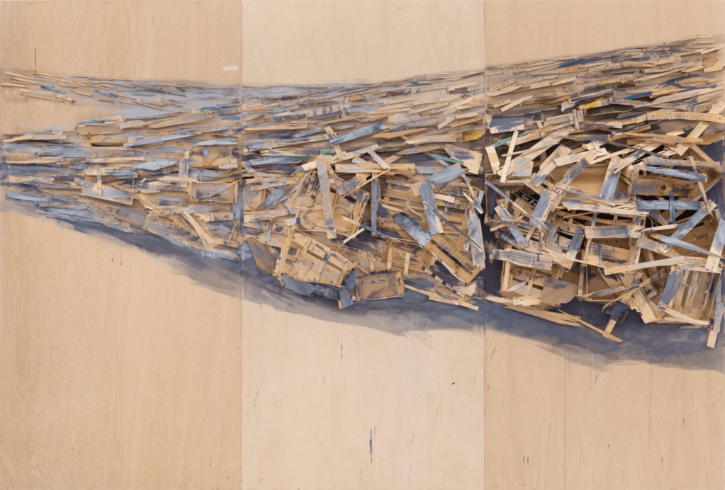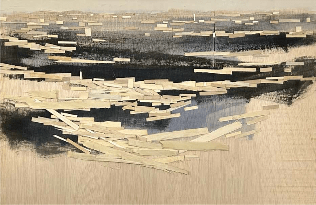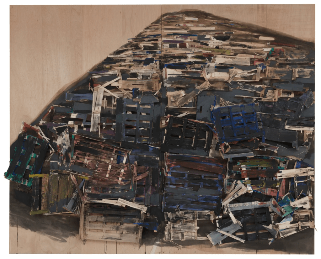 Kawamata began producing maquettes around 1980, during his years as a student at the Tokyo University of the Arts, and his fundamental method of gluing wooden pieces onto a painted board has remained unchanged ever since. He conceives these maquettes as works in their own right—autonomous objects whose creation offers him a solitary and reflective process, standing in contrast to his usual practice of participatory, in situ projects. Although some of them function as plans for upcoming installations—allowing him to visualize their spatial configuration—they extend far beyond the role of simple preparatory studies. At times, the artist creates maquettes without any specific project or location in mind, envisioning potential sites that may emerge in the future or exploring purely abstract formal possibilities.